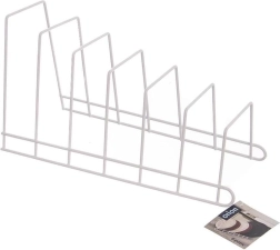 Organiseur de cuisine pratique en métal pour le rangement vertical de jusqu’à 6 pièces – couvercles, assiettes ou planches à découper. La structure filaire stable de couleur blanche économise de la place dans les placards et tiroirs, assure une vue d’ensemble et protège les couvercles contre les rayures. Se nettoie facilement et s’intègre parfaitement aux cuisines modernes comme classiques.