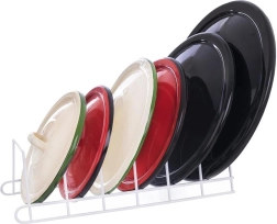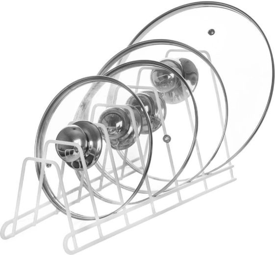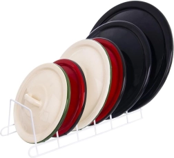 Le support convient à différentes tailles et types – des couvercles avec bouton aux assiettes plates et planches à découper, dans un placard ou sur le plan de travail.