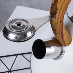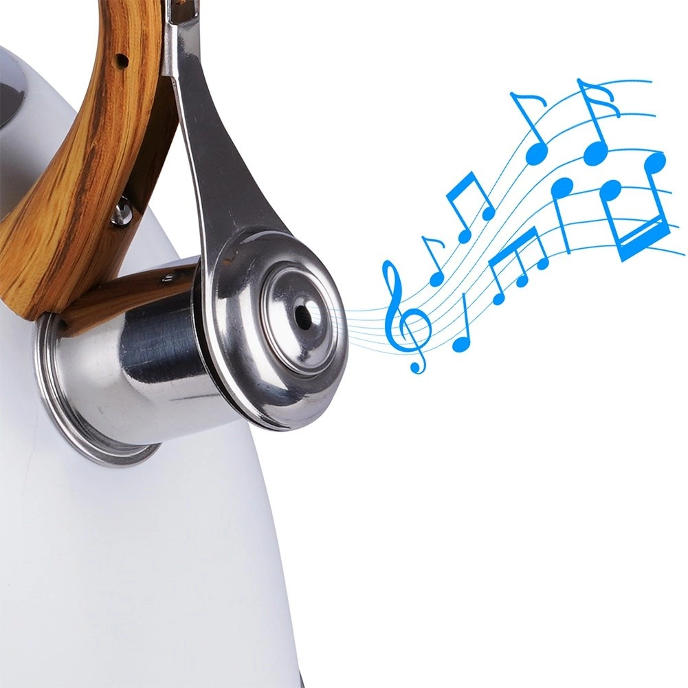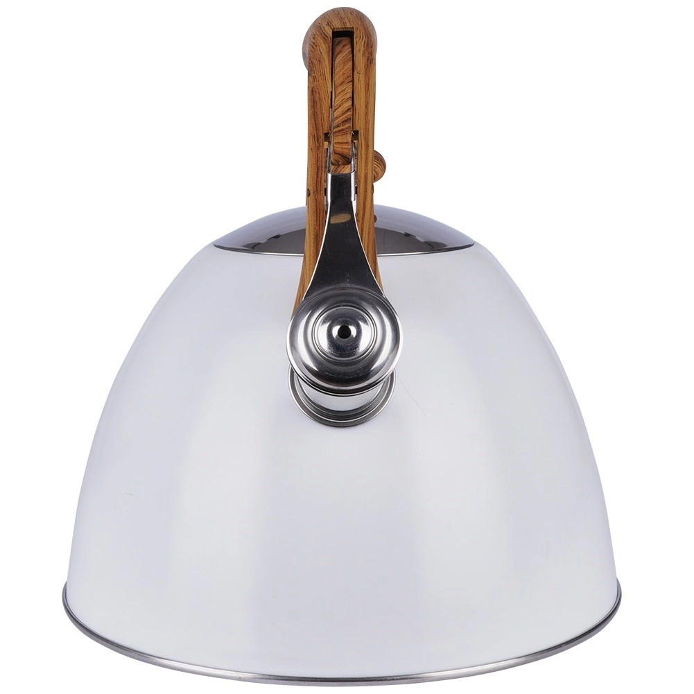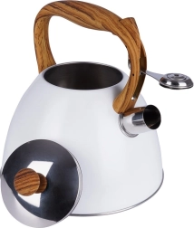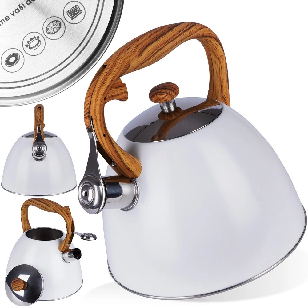 Cette bouilloire classique au design épuré combine acier inoxydable résistant, revêtement blanc moderne et poignée confortable à effet bois. Le sifflet à ouverture automatique dans la poignée facilite le service, tandis que le large couvercle permet un remplissage et un nettoyage aisés. Grâce à ses matériaux de qualité, elle ne modifie pas le goût de l’eau et assure un transfert de chaleur efficace.