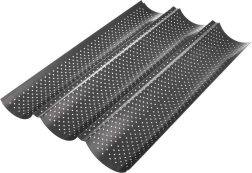 Moule pratique pour cuire jusqu’à 3 baguettes croustillantes en même temps. Fabriqué en acier carbone résistant avec un revêtement antiadhésif et doté d’une perforation pour une excellente circulation de l’air et une cuisson uniforme. Compatible avec fours à gaz et électriques, facile à nettoyer et compatible lave-vaisselle.