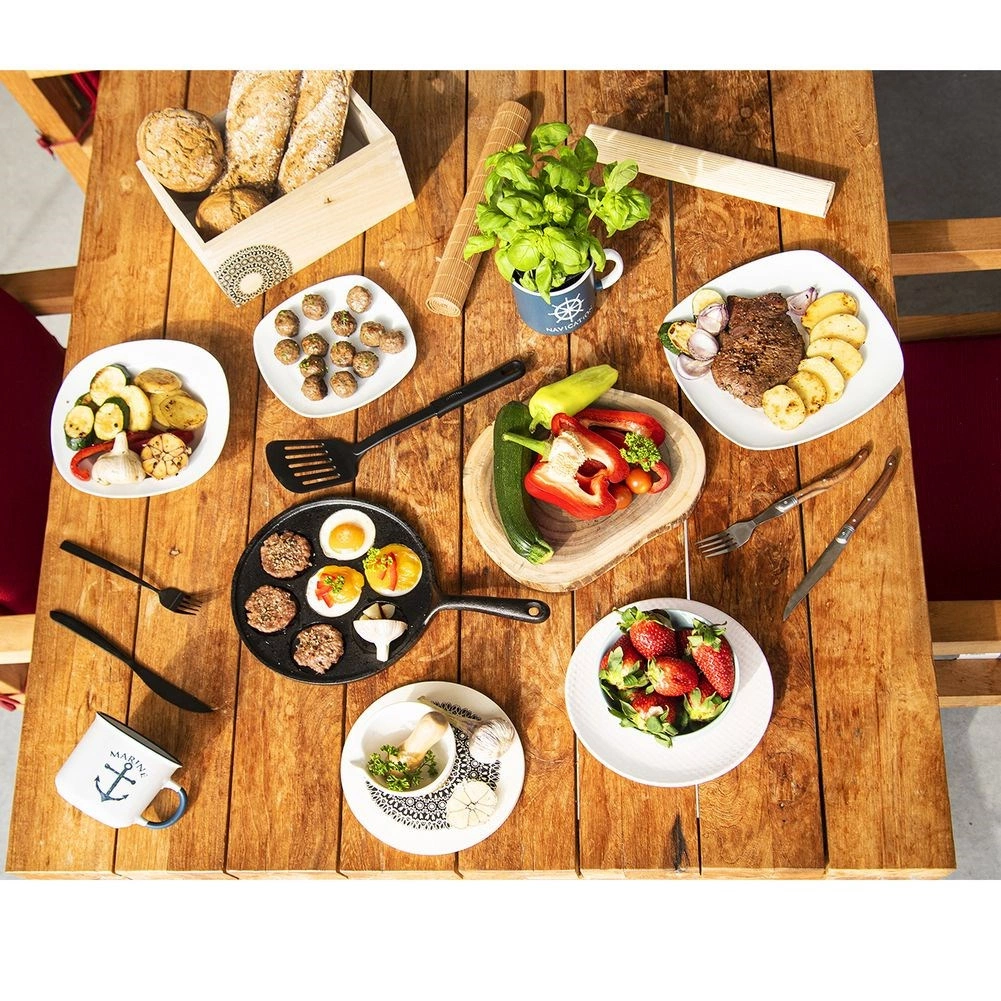 Le coffret comprend tout le nécessaire pour un repas confortable : 6× cuillère à soupe (21,5 cm, largeur 4,5 cm), 6× fourchette (21 cm), 6× couteau (23,5 cm) et 6× cuillère à café (14 cm). Acier inoxydable résistant et fabrication de qualité assurent une longue durée de vie. Les couverts passent au lave‑vaisselle, mais pour préserver l’aspect impeccable, nous recommandons un lavage manuel délicat.