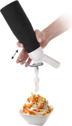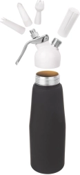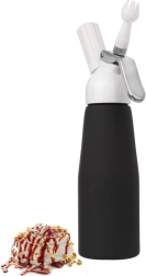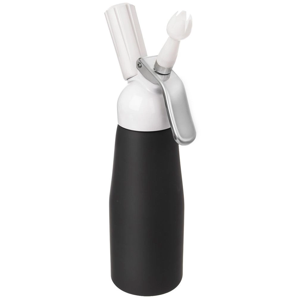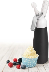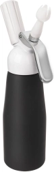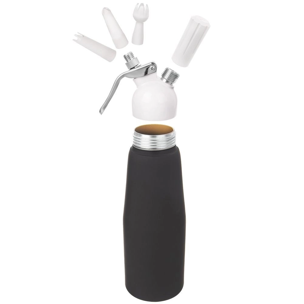 Réalisez une chantilly parfaitement aérienne en quelques secondes. Ce siphon de 680 ml permet de préparer environ 250 à 330 ml de chantilly prête à l’emploi en une seule charge. L’association d’un corps en aluminium noir et d’une tête blanche avec levier métallique assure durabilité, sécurité d’utilisation et longévité. Les trois buses interchangeables vous aident à créer des décorations élégantes sur desserts, gâteaux, boissons et autres plats.
