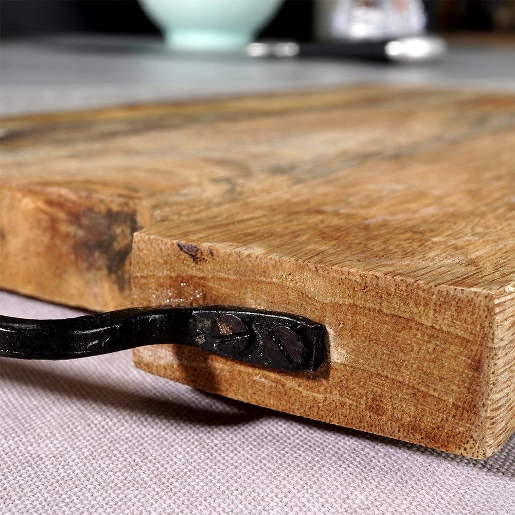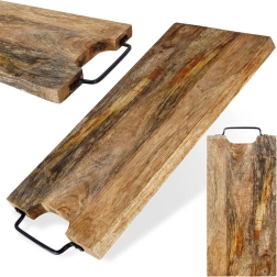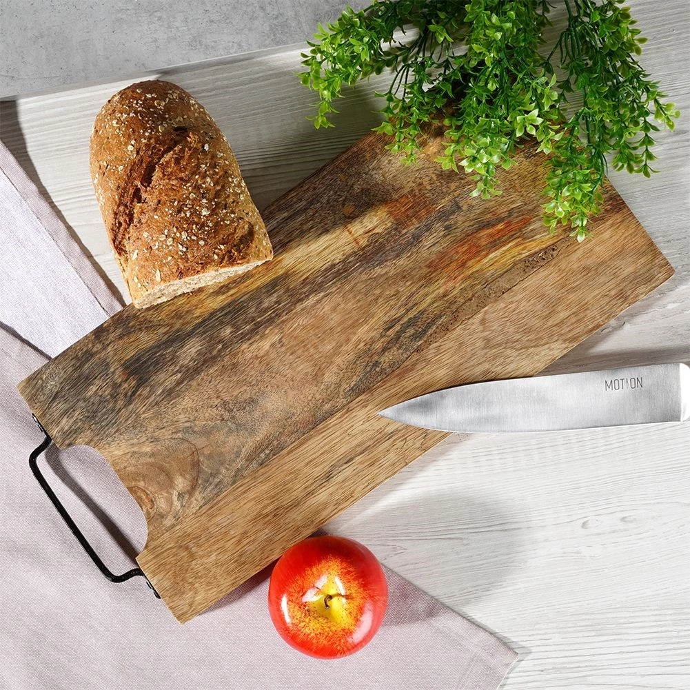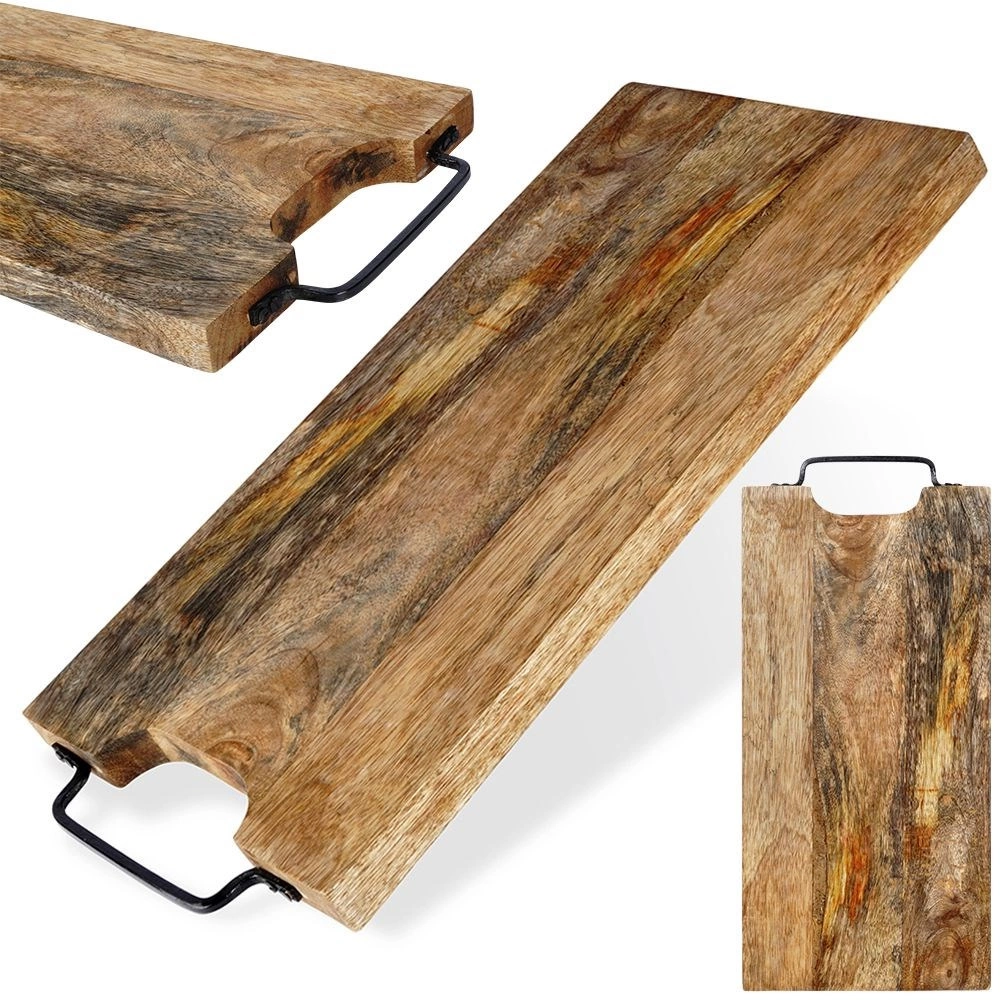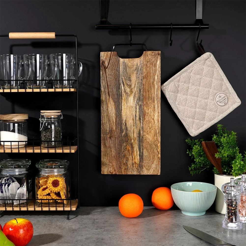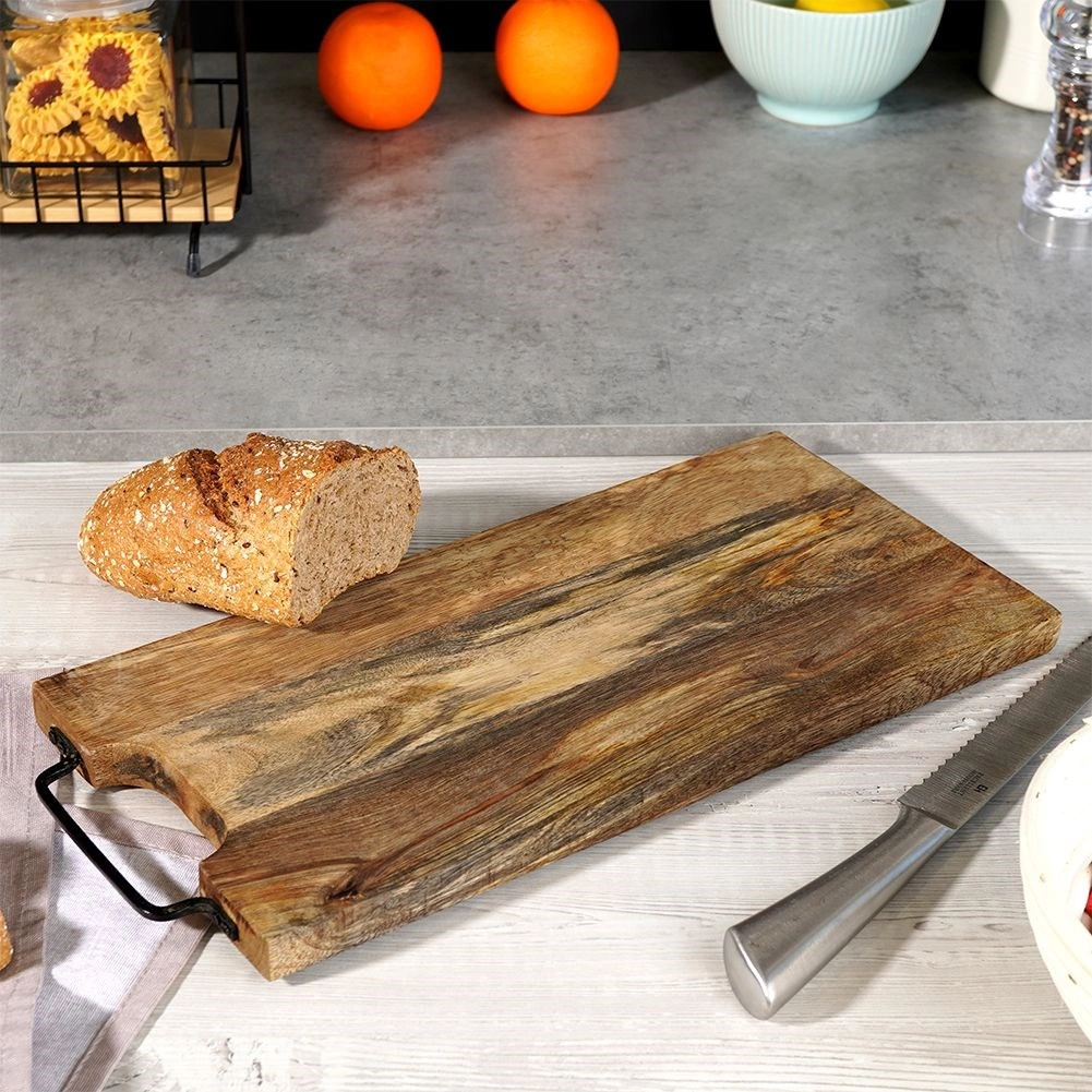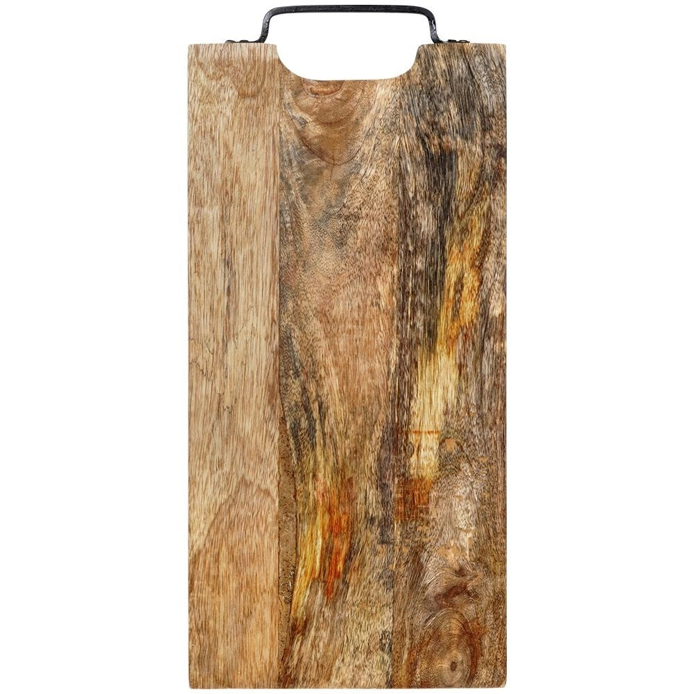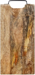 Solide planche en bois de manguier de dimensions 44 × 19 cm et d’épaisseur 2 cm, idéale pour la découpe comme pour le service. Elle offre une grande surface de travail, une poignée métallique pratique pour un transport facile ou une suspension, et une surface naturellement résistante qui n’absorbe pas les odeurs et sèche rapidement. Son style légèrement industriel est accentué par la poignée en métal noir.
