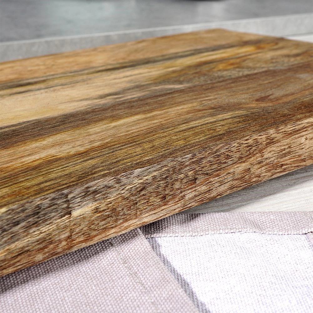 Planche en bois de manguier robuste et stable, naturellement résistante à l’humidité et aux déformations, n’absorbant pas les odeurs et séchant rapidement.