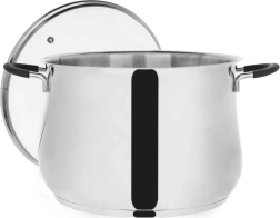 Faitout en acier inoxydable DALIE de 26 cm de diamètre et 10,6 l avec couvercle en verre, idéal pour la cuisine quotidienne et les plats mijotés. Fabriqué en acier inoxydable 18/10 de haute qualité, avec un fond acutech multicouche pour une répartition uniforme de la chaleur. Les poignées en silicone ne chauffent pas pendant la cuisson, le couvercle possède un orifice d’évacuation de la vapeur. Compatible avec tous les types de plaques, y compris induction, au four jusqu’à 200 °C (sans couvercle) et au lave-vaisselle.