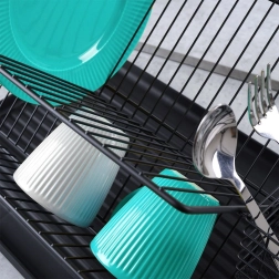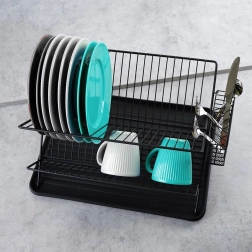 Élégant égouttoir à vaisselle à deux niveaux, de couleur noire, dimensions 45 × 32 × 25,5 cm, qui organise et sèche rapidement assiettes, bols, tasses et couverts. Grâce à sa structure métallique robuste, à ses pieds antidérapants et à son plateau d’égouttage amovible, votre plan de travail reste sec et propre. Son design industriel moderne s’intègre parfaitement à toute cuisine.