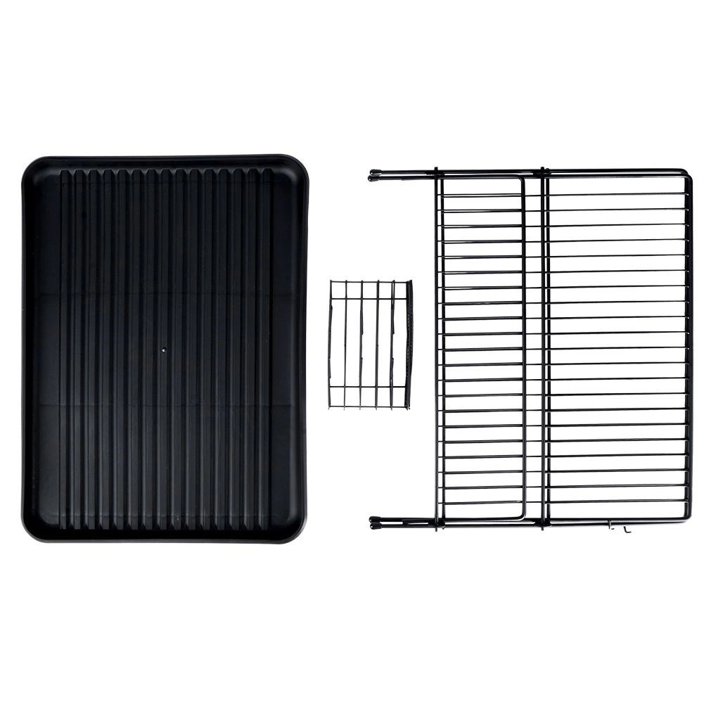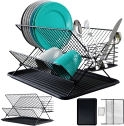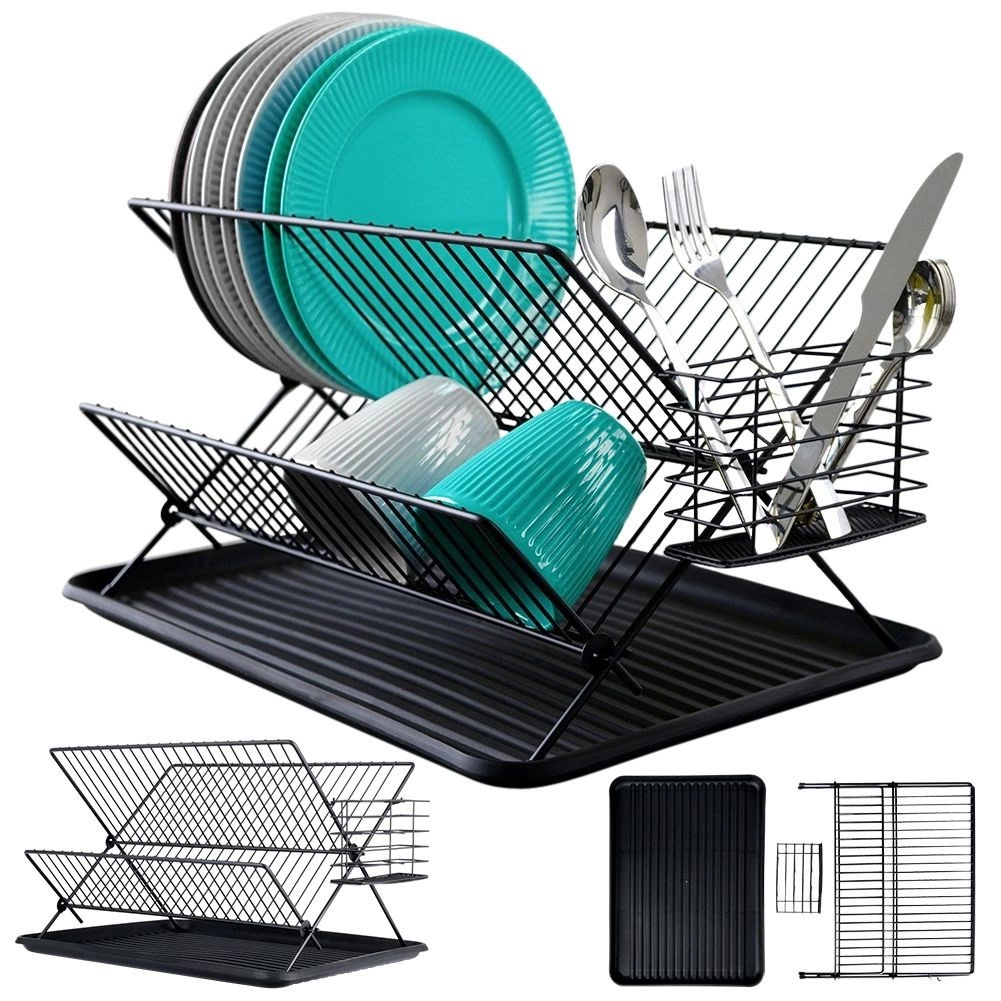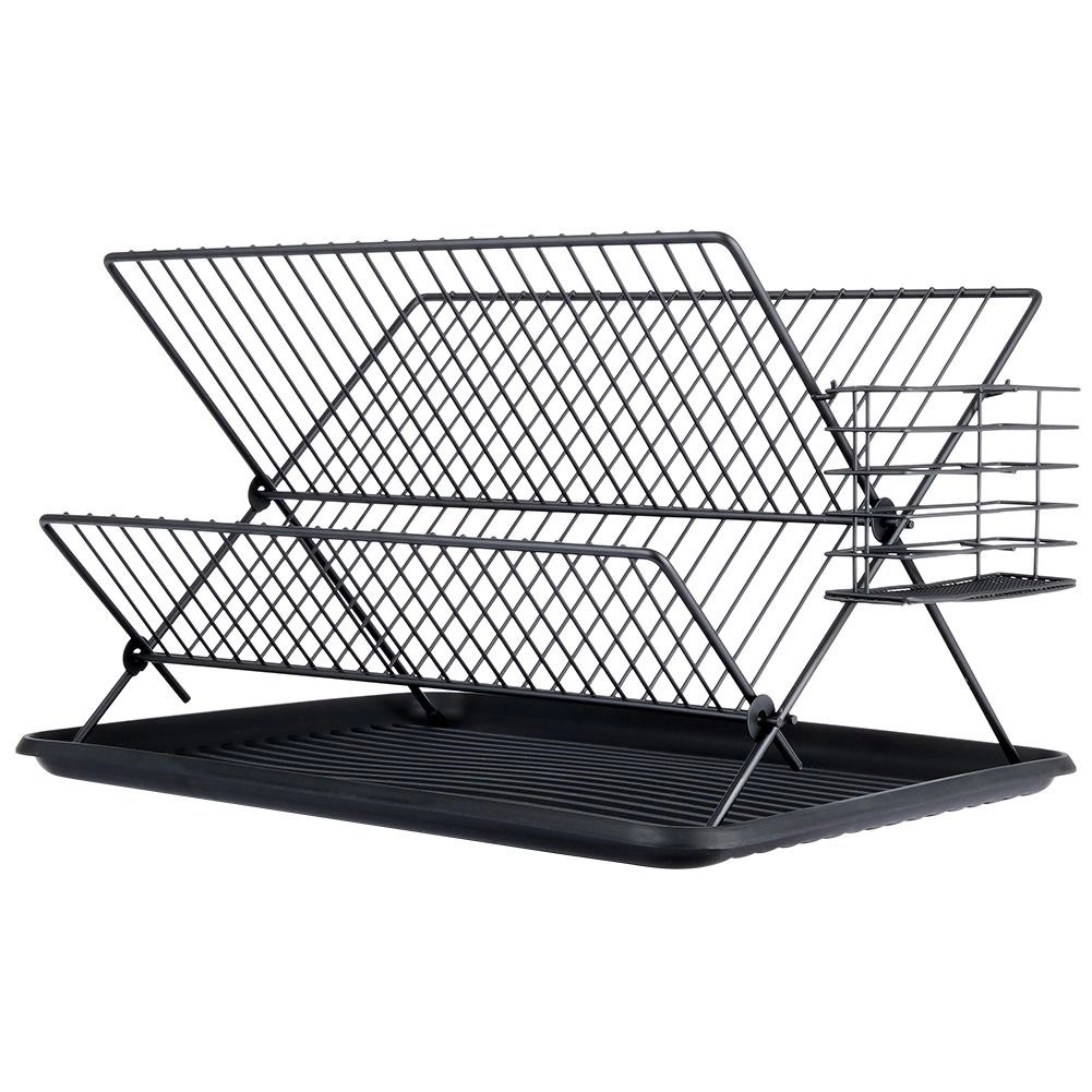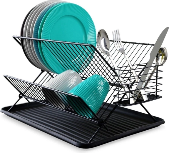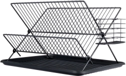 L’égouttoir est fabriqué en métal résistant avec une élégante finition noire, doté de pieds antidérapants pour plus de stabilité et d’un bac plastique amovible pour vider l’eau et nettoyer facilement. Sa construction pliable économise de la place quand vous n’avez pas besoin de la pleine capacité.
