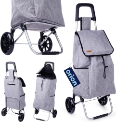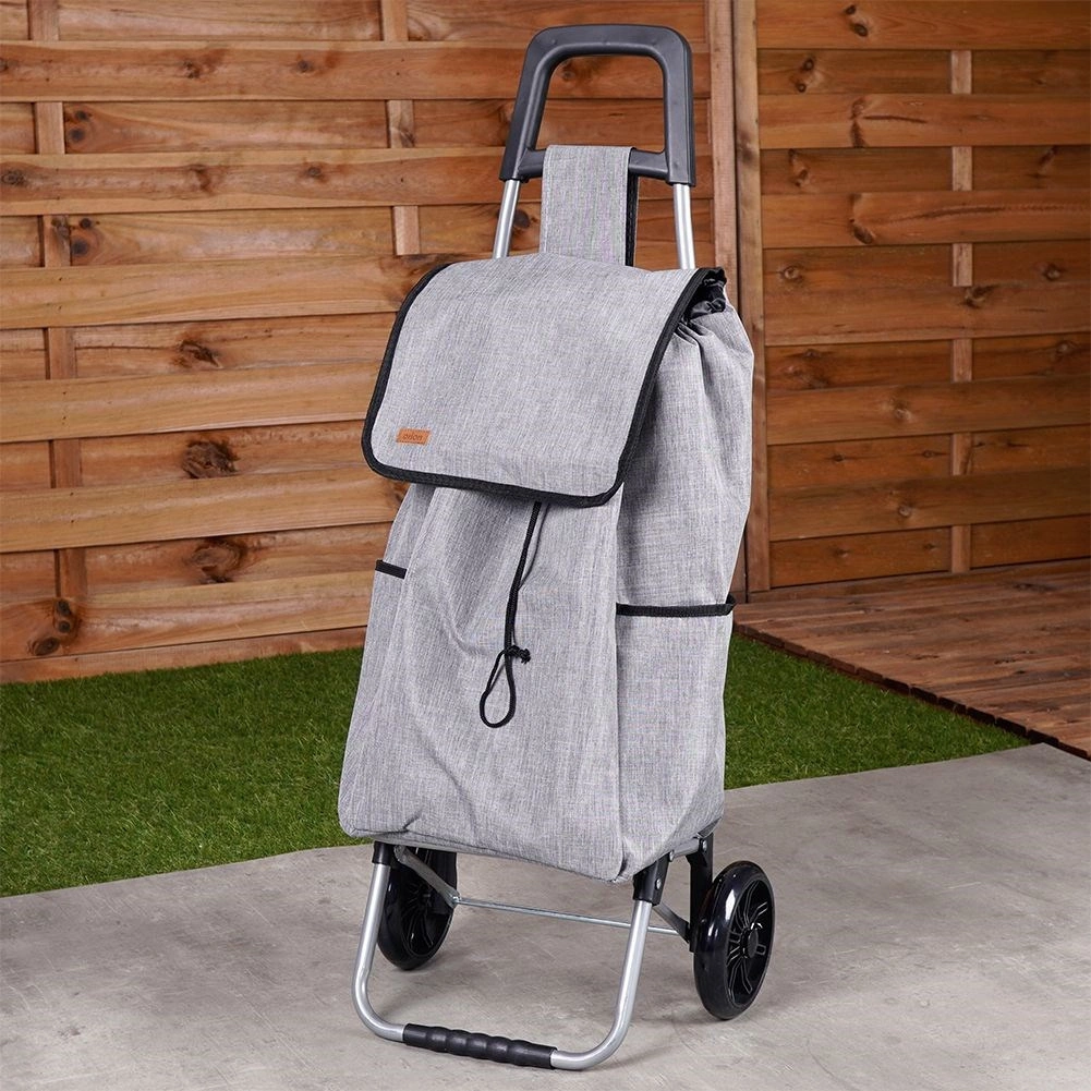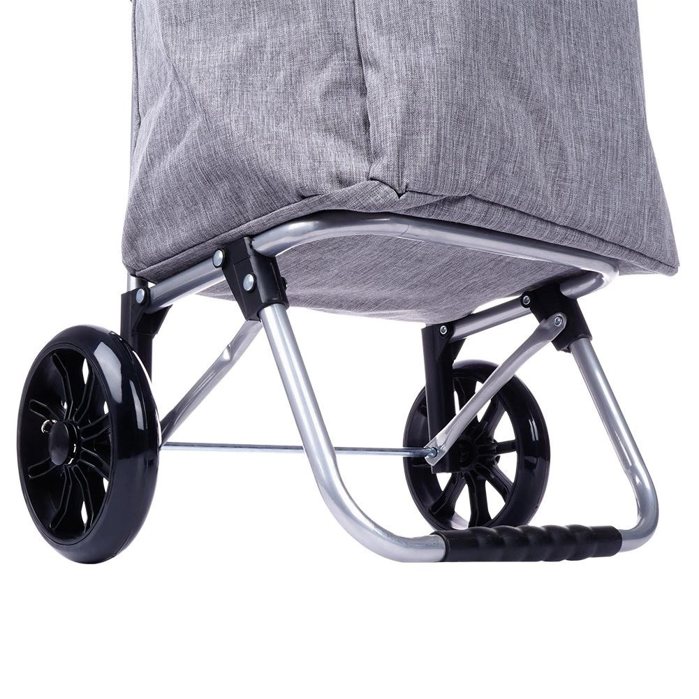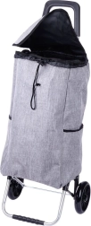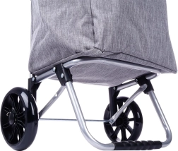 Le chariot de courses avec sac textile gris est conçu pour un transport des achats confortable et sécurisé. Son cadre métallique léger mais robuste avec deux grandes roues en plastique garantit stabilité et fluidité de mouvement. Le sac est protégé par un rabat et se ferme par un cordon de serrage, gardant le contenu en sécurité même par mauvais temps.