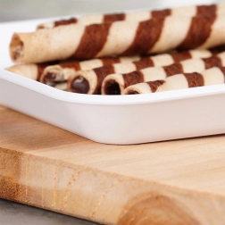 Le blanc pur aux angles arrondis se distingue sur toute table et met en valeur la présentation des desserts, snacks et petites bouchées.