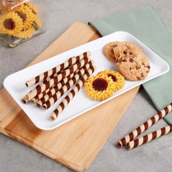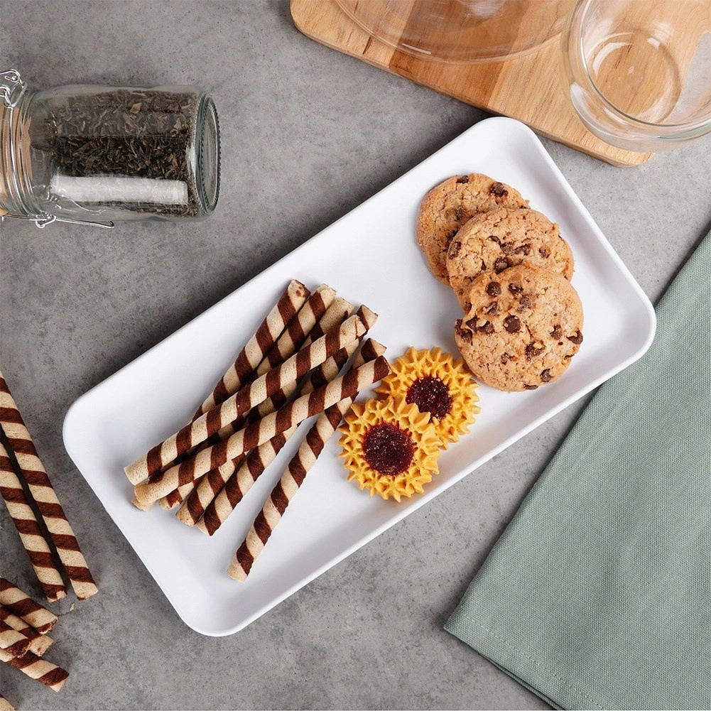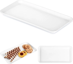 Élégant plateau de service blanc de forme rectangulaire, dimensions 29,5 × 15 × 2 cm, idéal pour un usage quotidien comme pour les repas festifs. Il est léger, résistant et facile à nettoyer. Parfait pour servir des encas sucrés et salés, des fruits ou de petites portions, et grâce à son design minimaliste il sublime toute table.