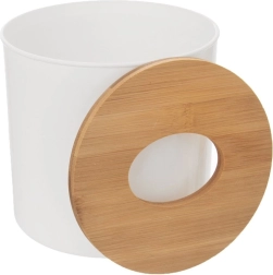 Petite mais pratique, cette poubelle est idéale pour les déchets du quotidien. Elle combine un corps en plastique blanc et un couvercle en bambou avec une ouverture centrale pour un jet rapide et hygiénique. Grâce à ses dimensions compactes, elle trouve sa place sur une étagère, un rebord de fenêtre ou un plan de travail.