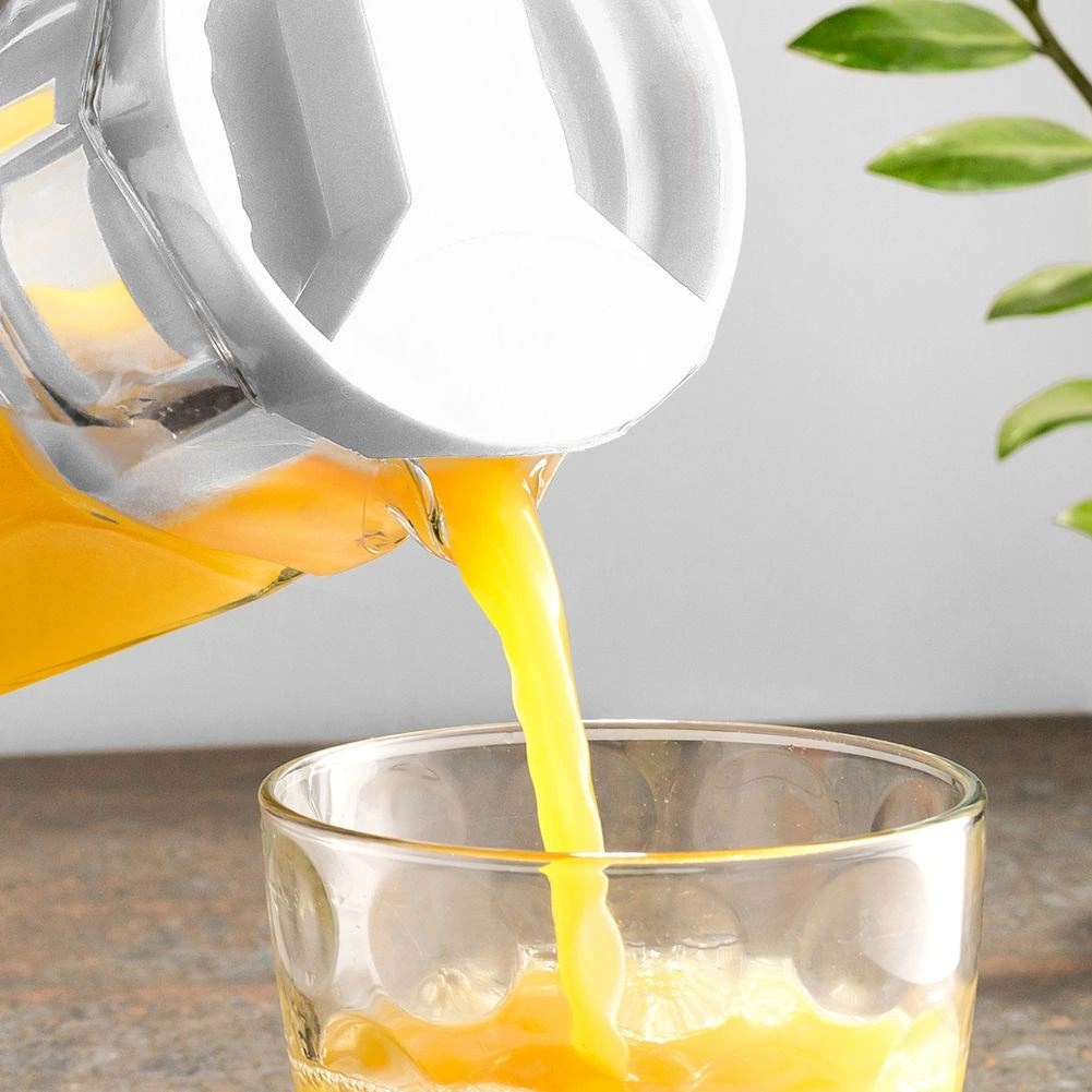 Le bec profilé et l’anse robuste assurent un versement précis et fluide. Idéal pour les jus, l’eau et la limonade – sans désordre sur la table.