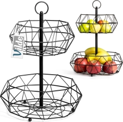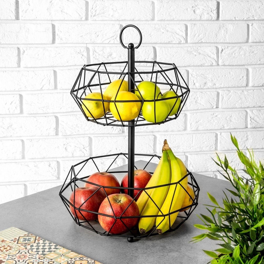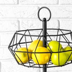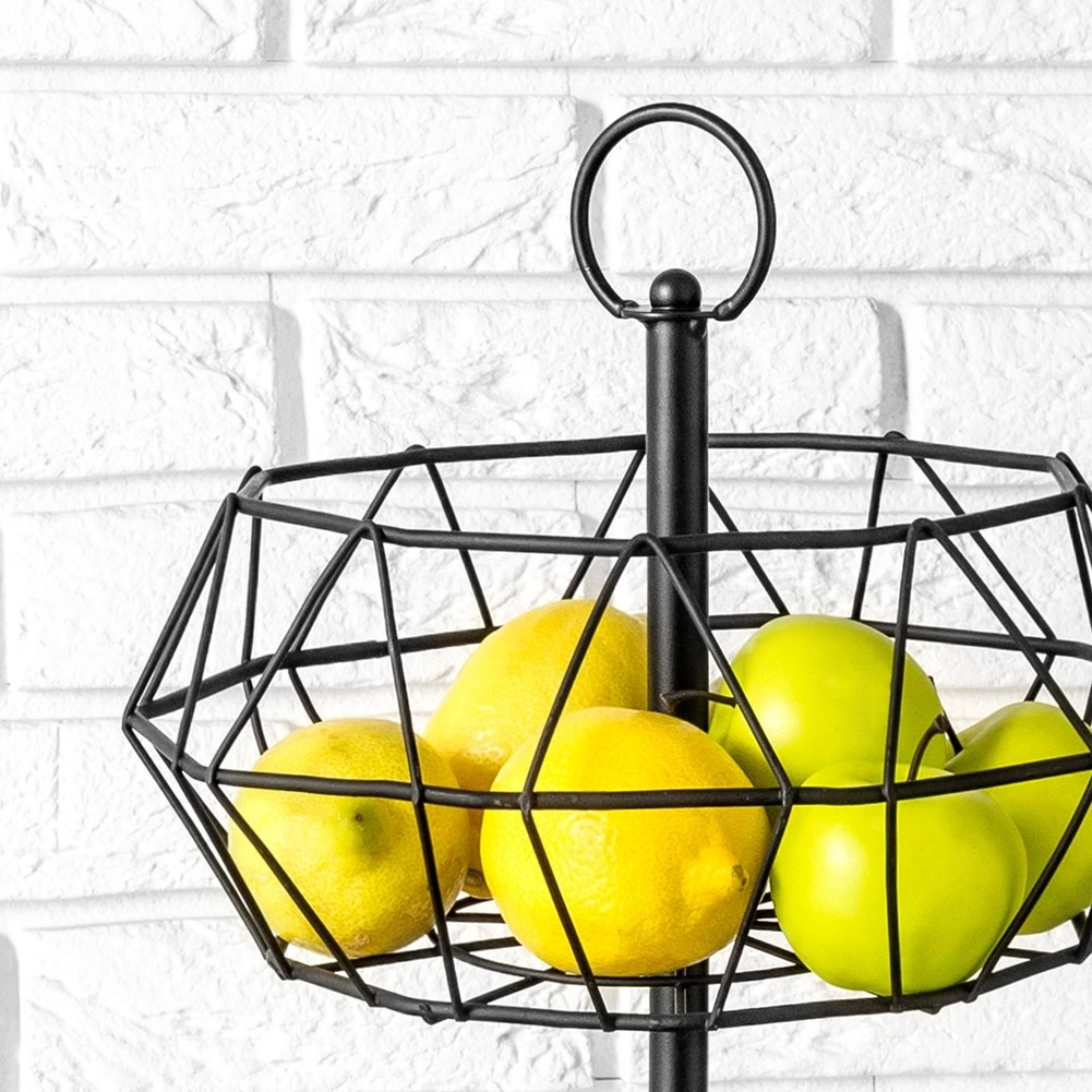 Élégant panier à deux niveaux en structure métallique filaire noire offrant un rangement pratique des fruits et légumes avec une circulation d’air naturelle. Grâce à son design géométrique moderne, il s’intègre parfaitement aux intérieurs modernes, industriels et glamour, tout en étant stable, facile à transporter et simple à entretenir.