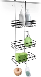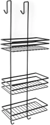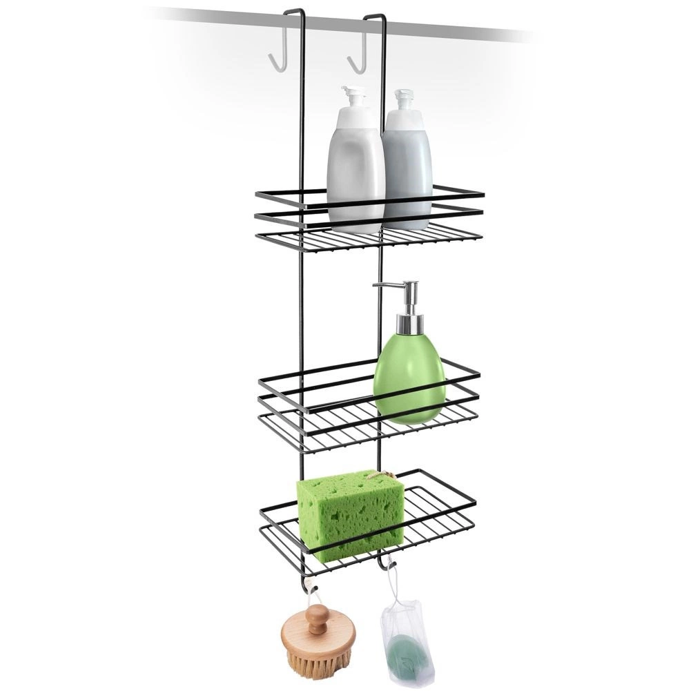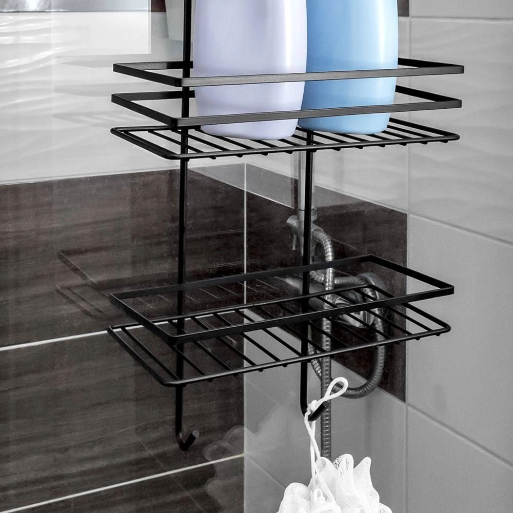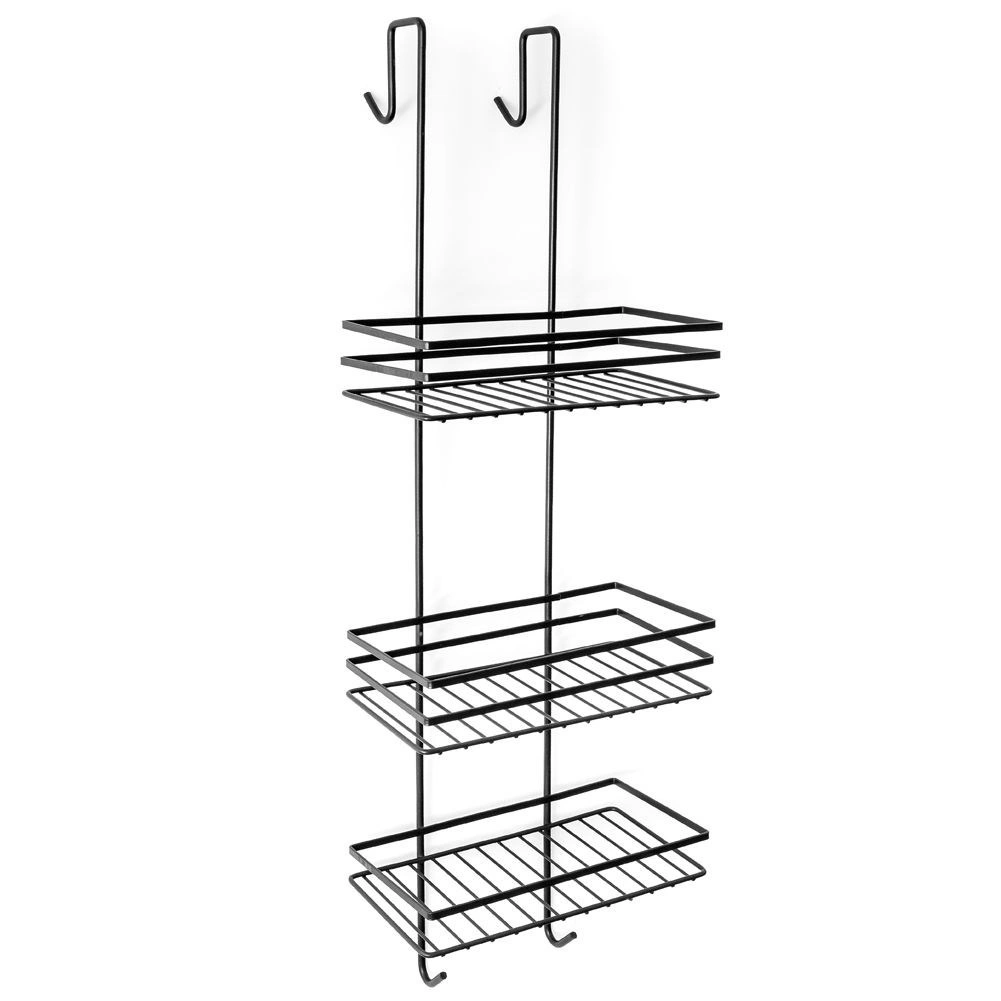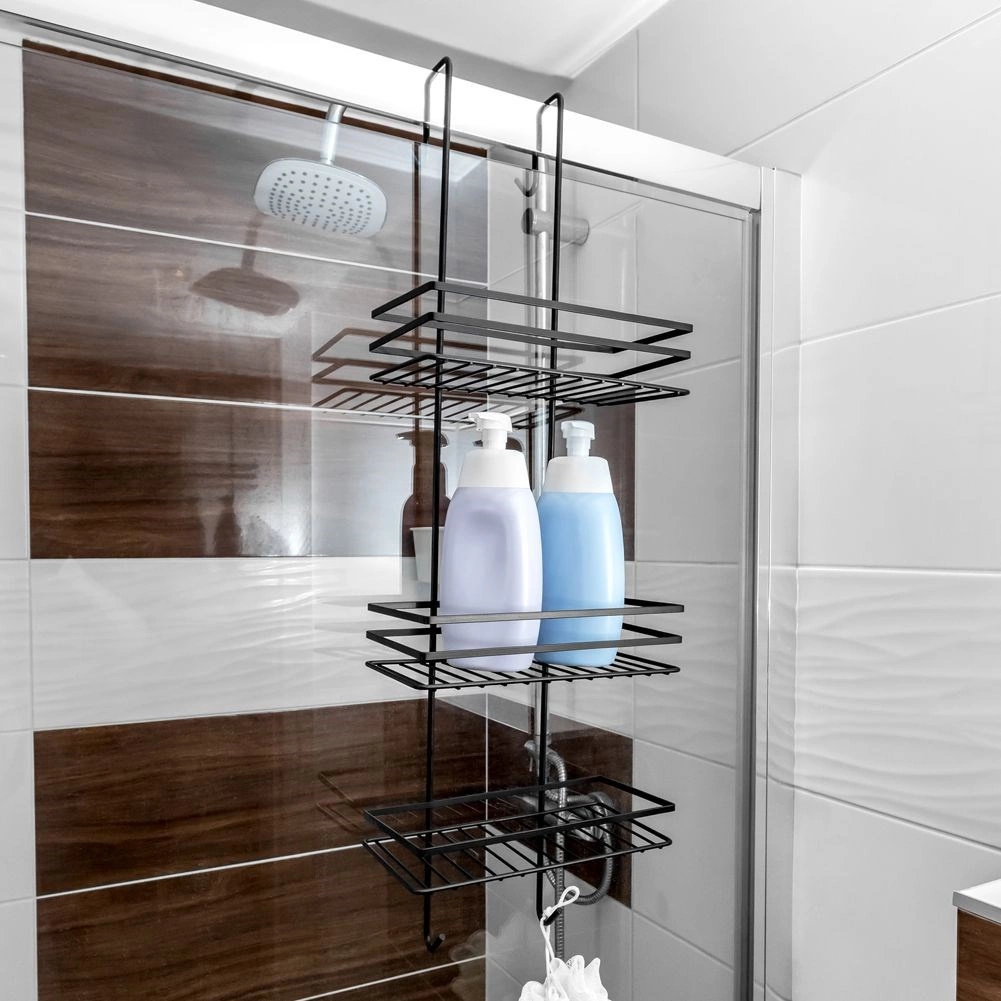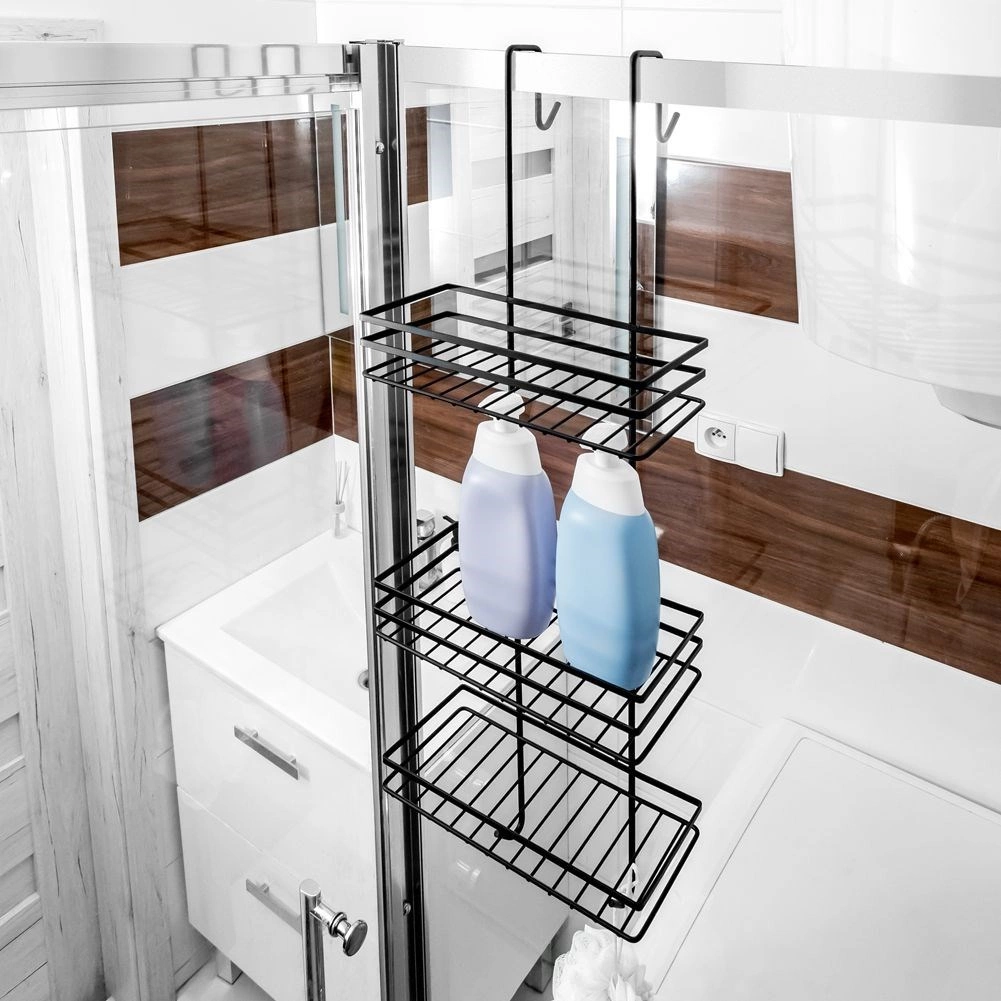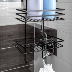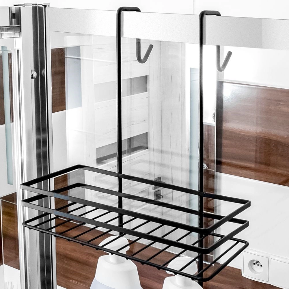 Pratique étagère de douche suspendue en élégante couleur noire, elle garde tous vos essentiels bien organisés et à portée de main. Elle offre trois étagères spacieuses pour shampoings et gels, quatre crochets pour éponges et brosses, et une installation sans perçage en la suspendant par-dessus le bord supérieur des portes vitrées de la douche. Métal durable avec revêtement poudré pour une longue durée de vie et un entretien facile.