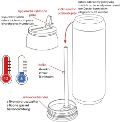 - Bec avec paille – boire confortablement sans incliner le mug.