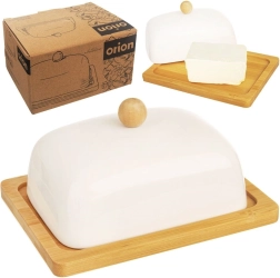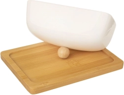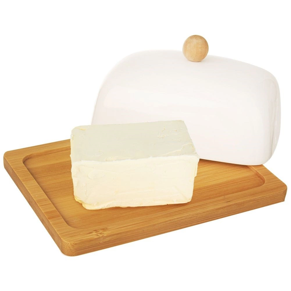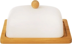 Élégant beurrier en porcelaine blanche avec plateau en bambou, protège le beurre des impuretés et des odeurs, le garde frais plus longtemps et embellit votre table. Grâce au couvercle avec poignée en bois, il s’ouvre facilement ; un choix pratique, hygiénique et stylé pour le service au quotidien.