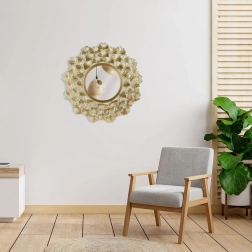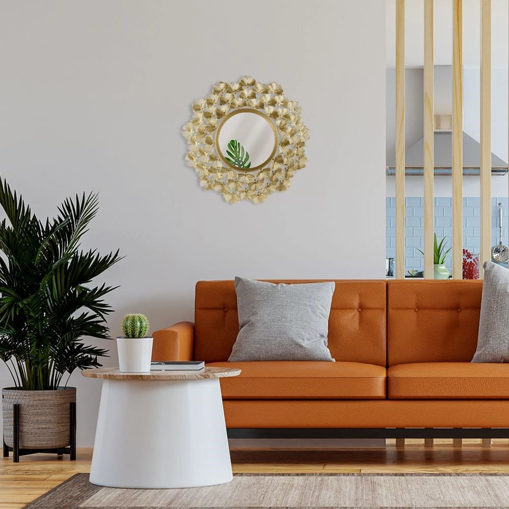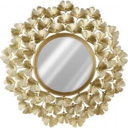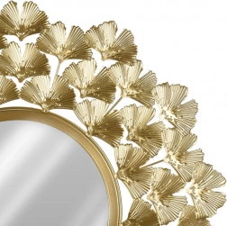 Ce miroir mural décoratif se distingue par sa forme circulaire et sa structure de cadre métallique spectaculaire de couleur dorée. Le cadre est composé d’éléments inspirés des feuilles de ginkgo, conférant au miroir une apparence unique et luxueuse. Grâce à son design, il illumine et agrandit visuellement tout espace.