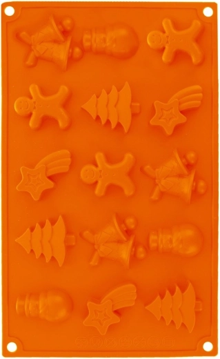 Le moule de cuisson en silicone à motifs de Noël permet de préparer jusqu’à 15 pièces de biscuits ou de pralinés en cinq formes : petit bonhomme, sapin, bonhomme de neige, étoile et clochette. Il est résistant de -40 °C à +220 °C, compatible avec le four, le micro-ondes et le congélateur, et passe au lave-vaisselle. Grâce au silicone antiadhésif, la pâte se démoule facilement et le moule n’absorbe ni les odeurs ni les saveurs.