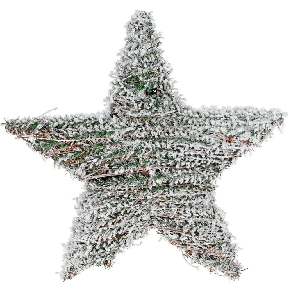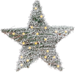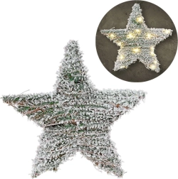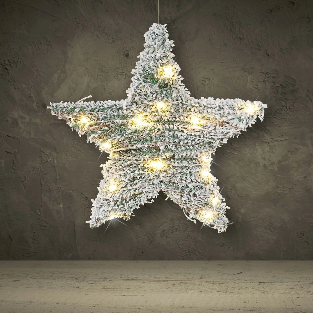 Cette élégante étoile combine l’aspect d’une décoration de conifères enneigés avec la chaleureuse lumière LED, créant une ambiance festive agréable. Grâce à l’alimentation à piles, vous la placez facilement n’importe où à l’intérieur — sur un mur, une porte, une fenêtre ou simplement appuyée sur une commode ou une étagère.