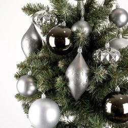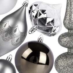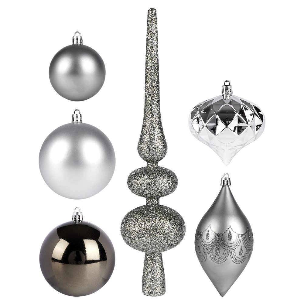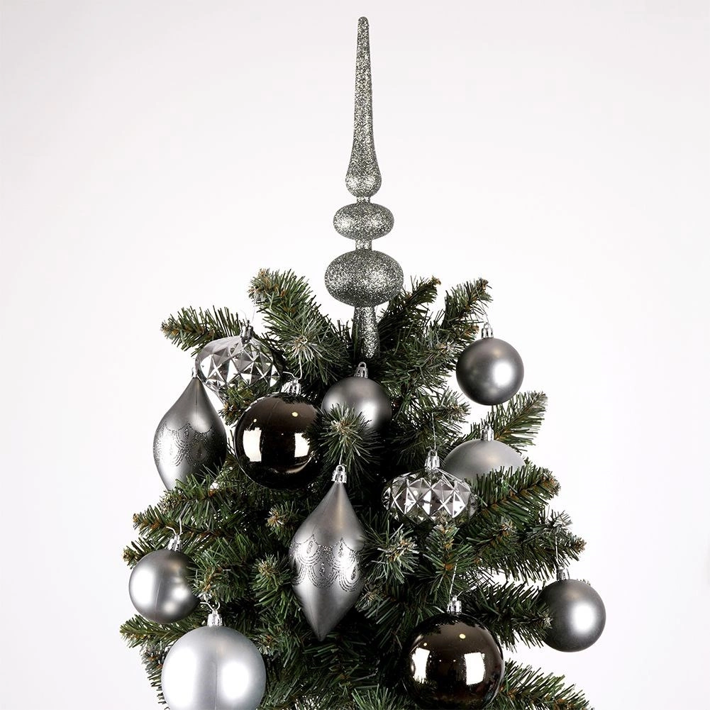 Créez un sapin harmonieusement assorti grâce à ce set complet de décorations dans des tons argent modernes. Les différentes formes et finitions — mat, brillant et glitter — apportent profondeur, éclat et contrastes élégants. Une pointe de sapin de 30 cm vient couronner l’ensemble.