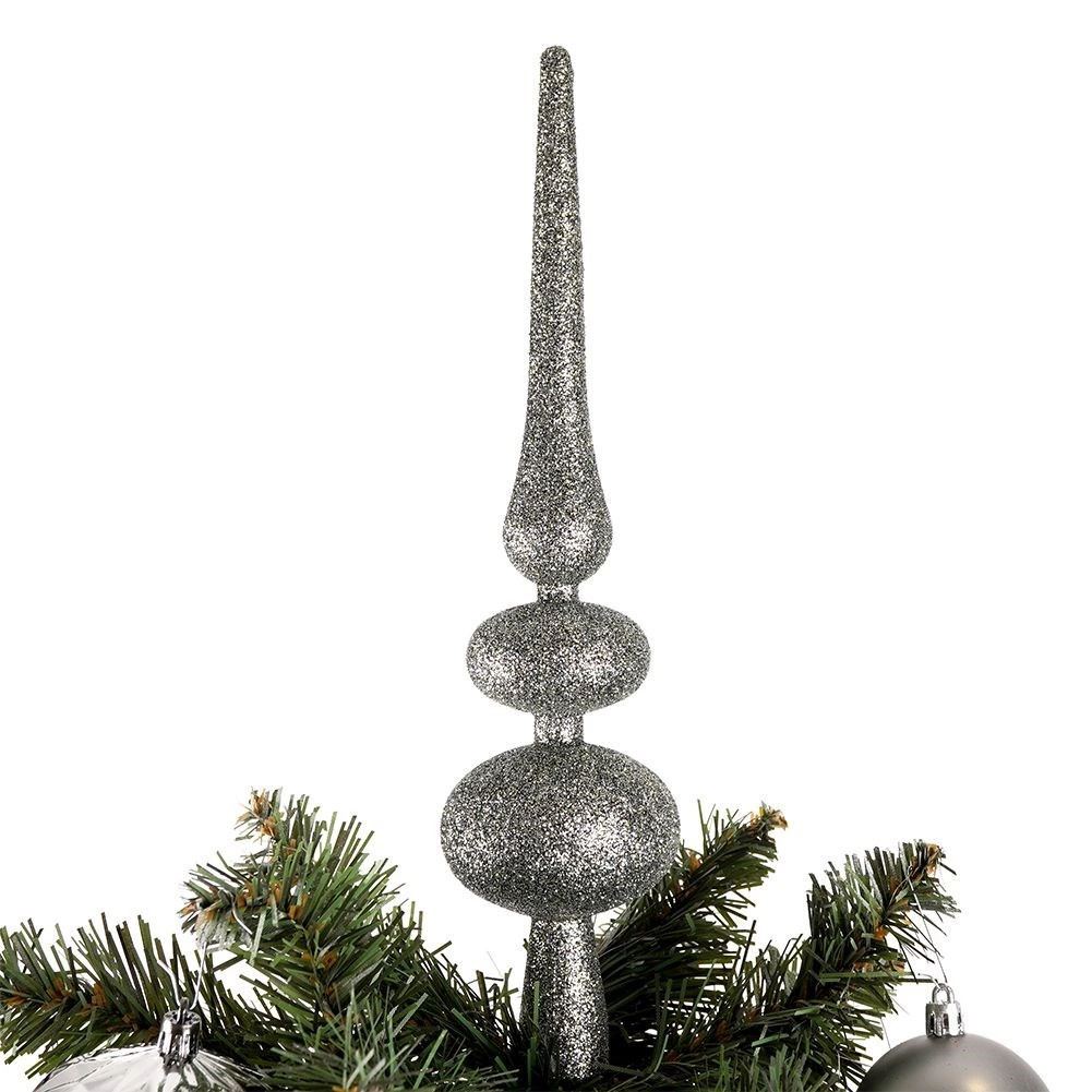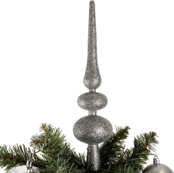 Une pointe argentée spectaculaire avec paillettes met en valeur le sommet du sapin et confère à l’ensemble une allure professionnelle.