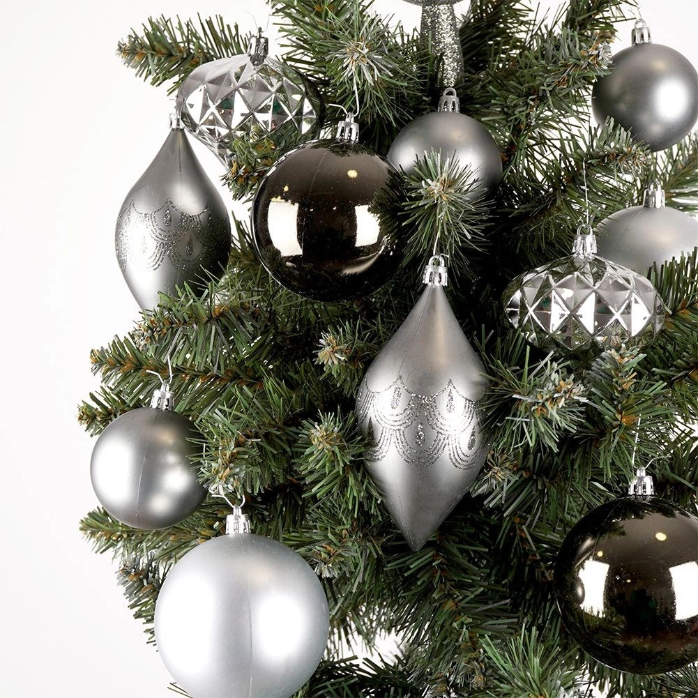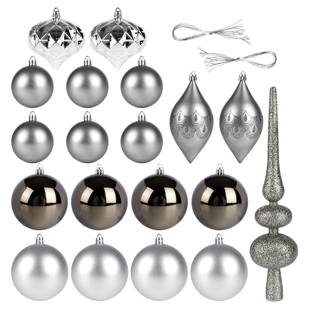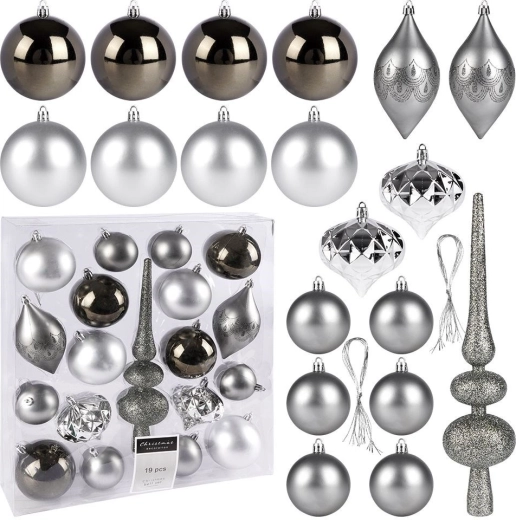 Élégant set de 19 décorations de Noël dans des tons argent et graphite pour décorer rapidement et avec style votre sapin. Il combine des finitions mates, brillantes et pailletées, et inclut une pointe scintillante (30 cm). Les décorations sont en plastique de qualité incassable, sûres pour les foyers avec enfants et animaux, tout en imitant fidèlement le verre.