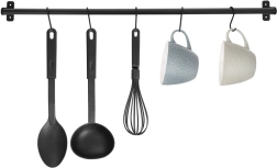 Pratique tringle de cuisine en métal de couleur noire, longueur 78,5 cm, offrant une solution suspendue peu encombrante pour les ustensiles. Elle comprend 5 crochets mobiles pour les cuillères, louches ou fouets et, grâce à sa structure métallique robuste, elle résiste à des années d’utilisation quotidienne. Montage mural facile et look élégant pour cuisines modernes comme traditionnelles.