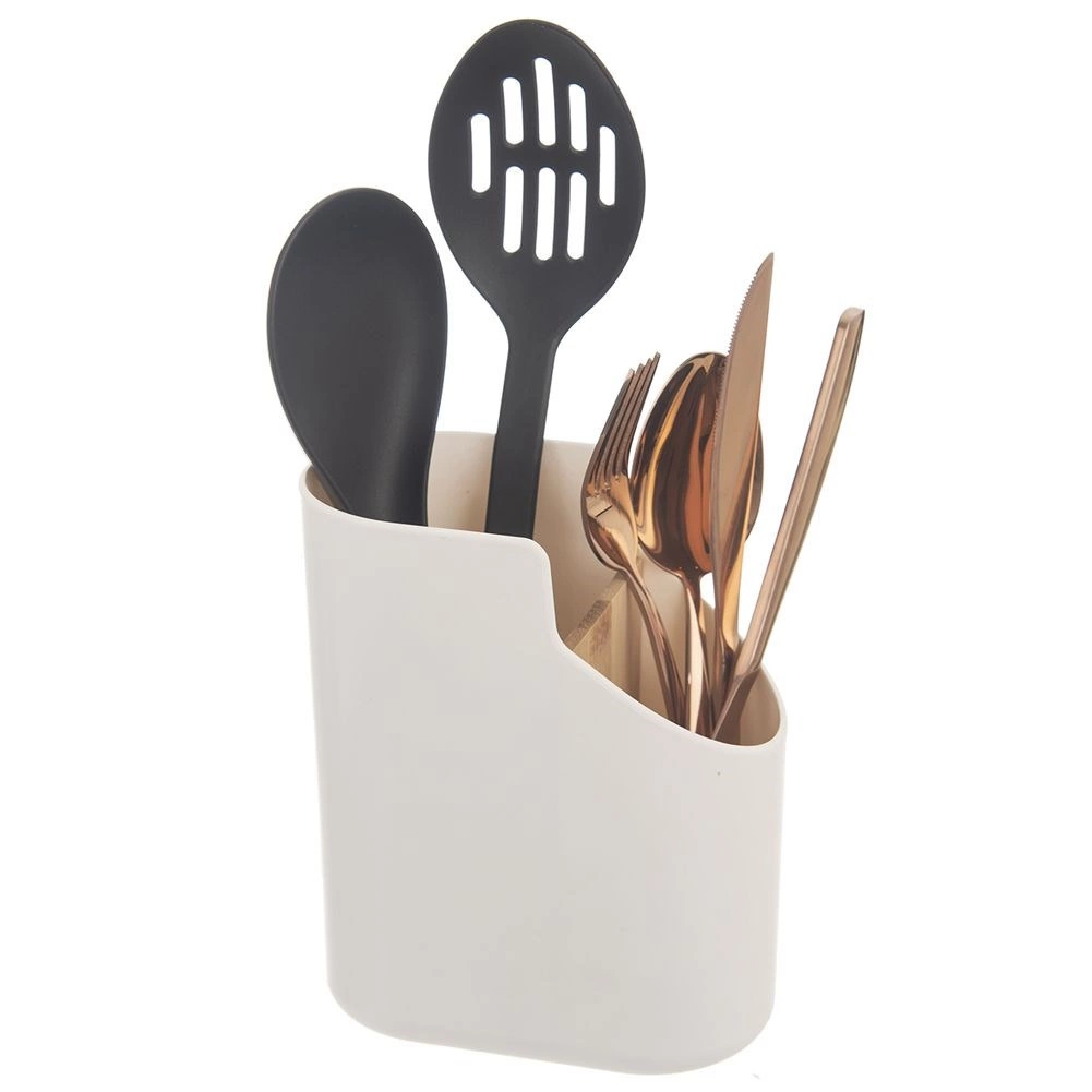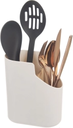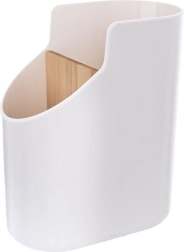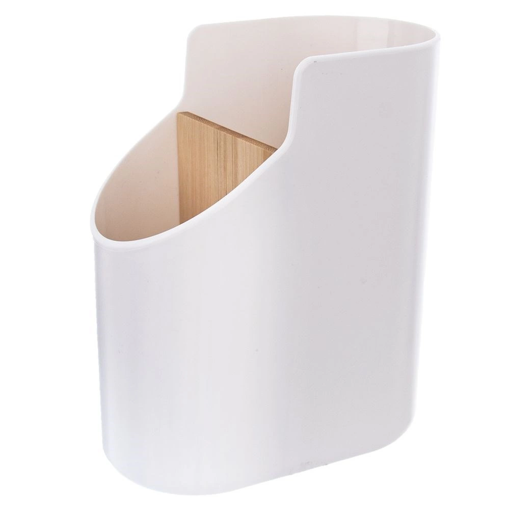 Organiseur pratique pour ustensiles de cuisine et couverts avec un corps blanc élégant et une cloison amovible en bambou. Grâce à la double compartimentation, au fond perforé et à la base antidérapante en silicone, tout reste bien rangé et au sec. Léger, durable et facile à nettoyer – l’accessoire idéal pour toute cuisine.