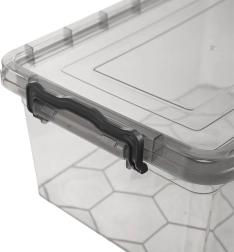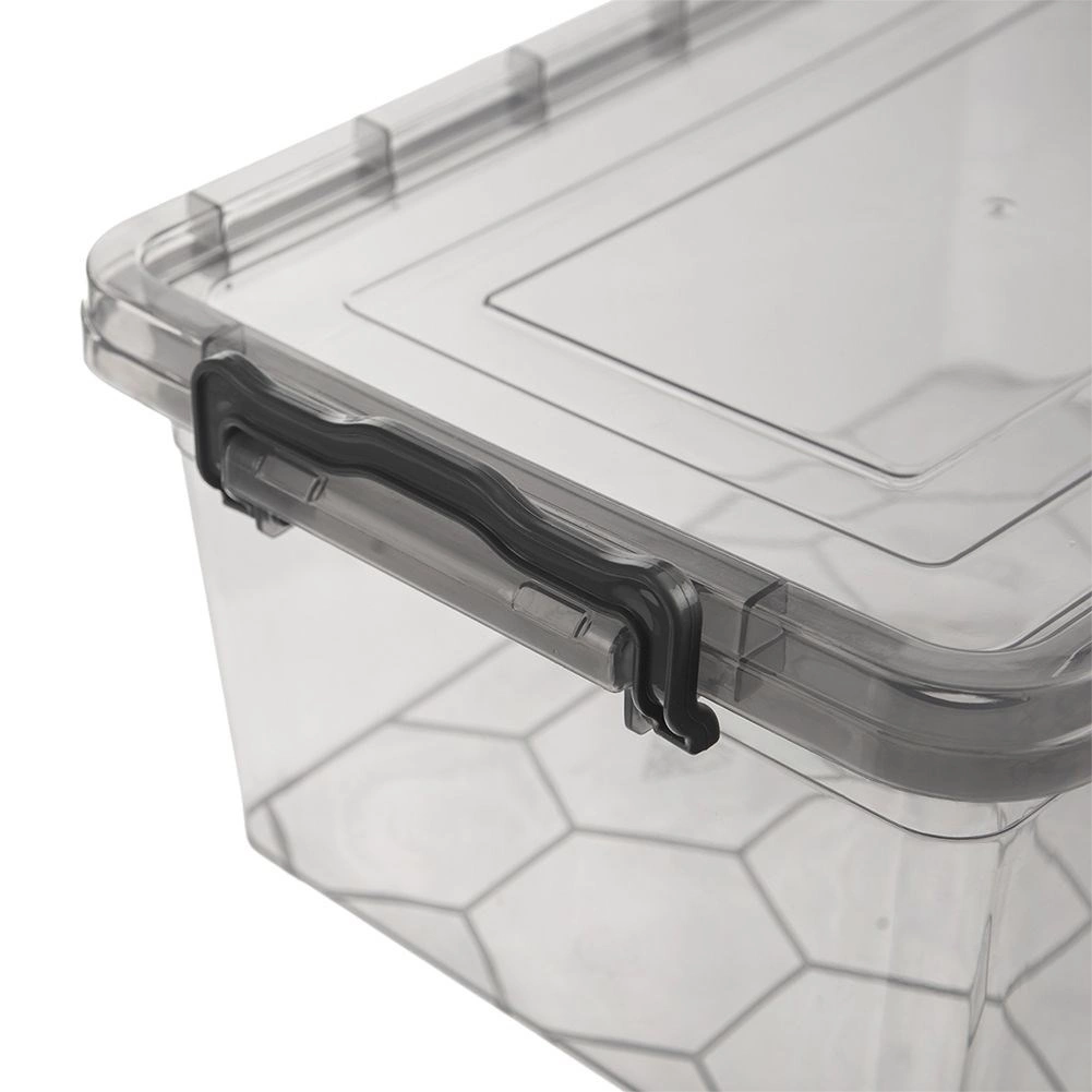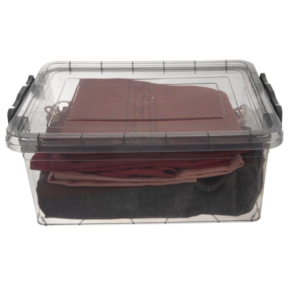 Boîte en plastique universelle de 14 l avec couvercle sécurisé à clips, idéale pour le stockage des aliments, des vêtements et des petits objets. Grâce à sa finition transparente gris foncé, vous voyez facilement le contenu sans ouvrir. Le matériau est sans BPA, résiste à des températures de -25 °C à +95 °C, compatible lave-vaisselle, micro-ondes (sans couvercle), réfrigérateur et congélateur. Le couvercle verrouillable avec deux clips protège le contenu de l’humidité et de la poussière et permet un transport en toute sécurité.