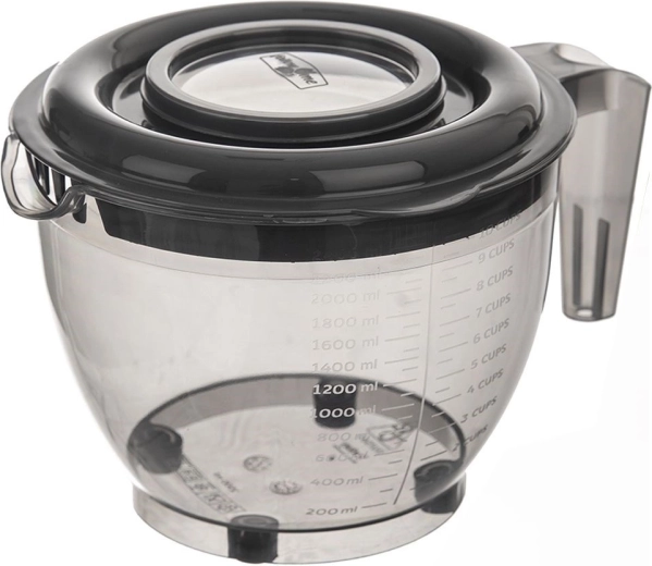 Bol pratique de 2,5 l pour mélanger, fouetter et verser en toute facilité. Il possède un couvercle anti-éclaboussures en deux parties, une anse confortable, un bec verseur précis et un doseur intégré en ml et en tasses. Fabriqué en plastique résistant, sans BPA et sûr pour la santé, compatible lave-vaisselle et micro-ondes (sans le couvercle), avec pieds antidérapants stables.