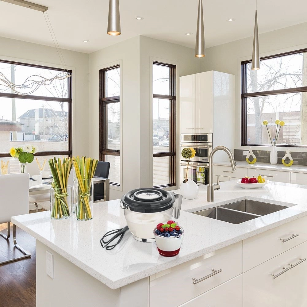 Le doseur intégré 200–2400 ml et l’échelle en tasses 1–10 simplifient le travail sans avoir besoin d’un récipient supplémentaire. Quatre pieds antidérapants maintiennent le bol fermement en place, et l’anse ergonomique assure une prise en main sûre. Le matériau est sans BPA, compatible lave-vaisselle, réfrigérateur et congélateur, et résiste à des températures de -25 °C à +95 °C.