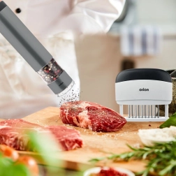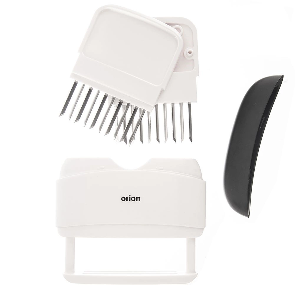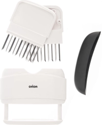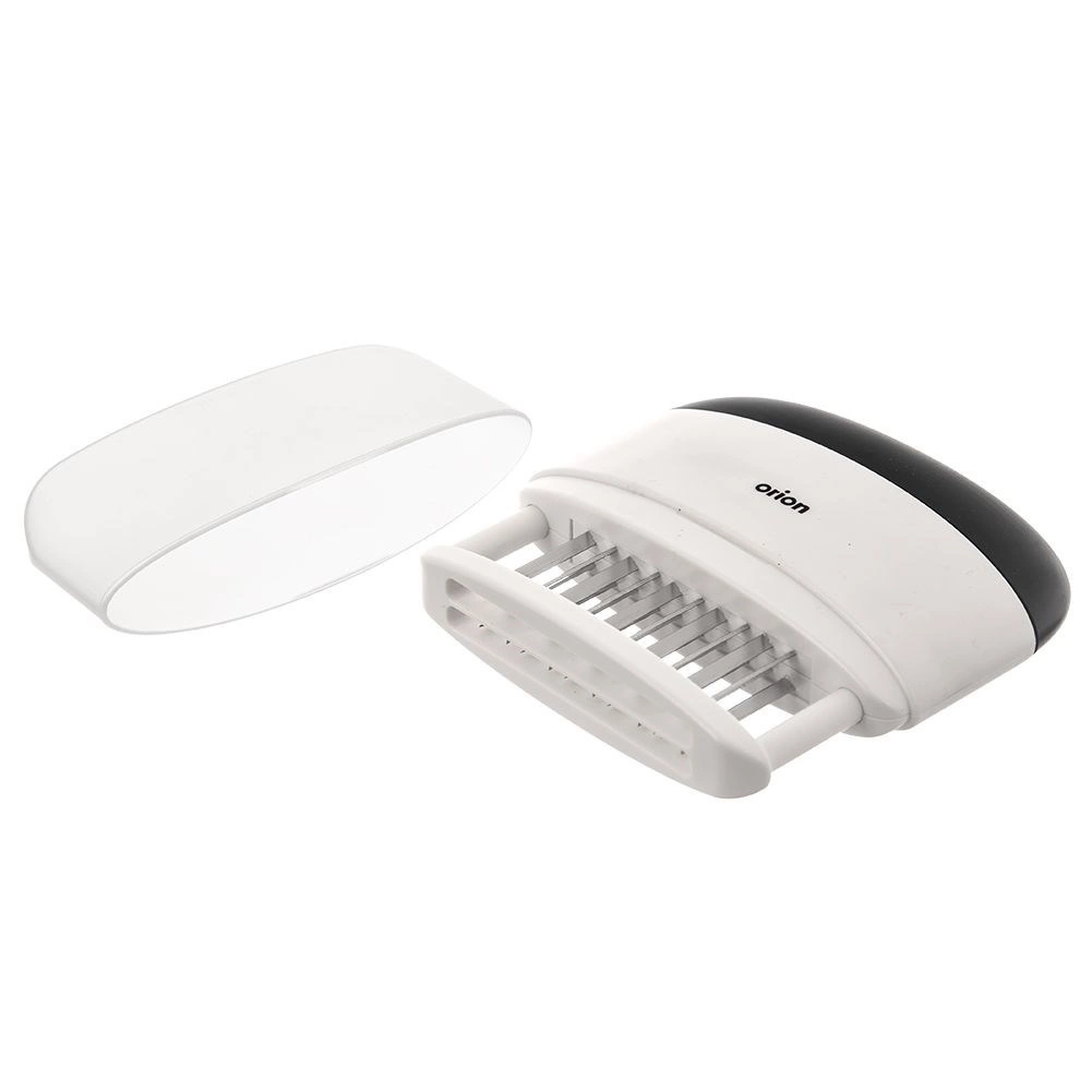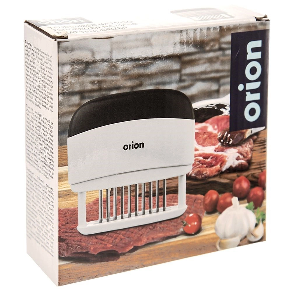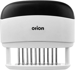 Pratique attendrisseur et injecteur de viande ORION avec 20 aiguilles en acier inoxydable assurant un ramollissement rapide et une imprégnation uniforme par la marinade. Grâce à sa poignée ergonomique, il est confortable à utiliser, durable, tranchant et sécurisé grâce au capuchon de protection. Idéal pour le grill comme pour la poêle afin d’obtenir des steaks et des escalopes juteux.