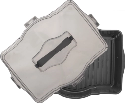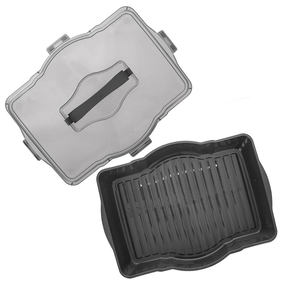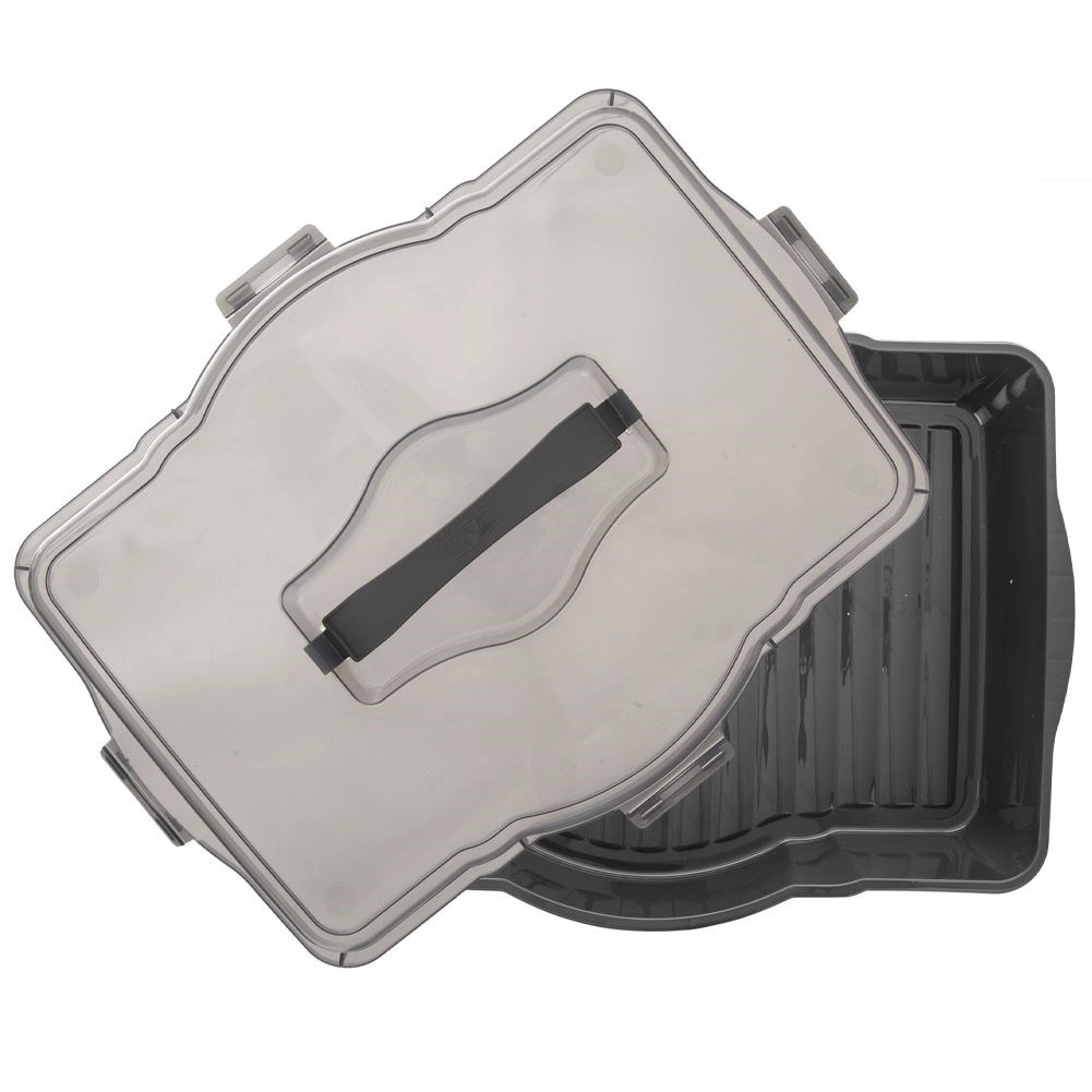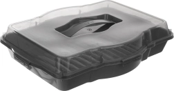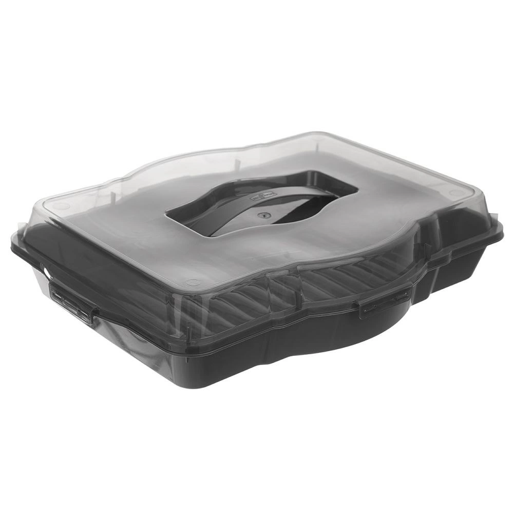 Boîte de transport alimentaire pratique et spacieuse avec fermeture à 4 clips, couvercle transparent avec poignée et corps en plastique résistant de couleur grise. Idéale pour gâteaux, pâtisseries, sandwichs, fromages et charcuterie, elle garde les aliments frais et protégés lors du transport et du service. Compatible réfrigérateur, congélateur et chauffage au micro-ondes sans couvercle, passe au lave-vaisselle.