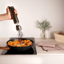 Il suffit d’appuyer et le moulin broie. Grâce à sa forme ergonomique, vous l’utilisez confortablement d’une seule main, directement au-dessus de la poêle ou de l’assiette.