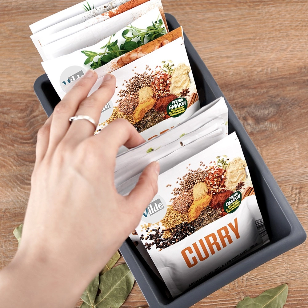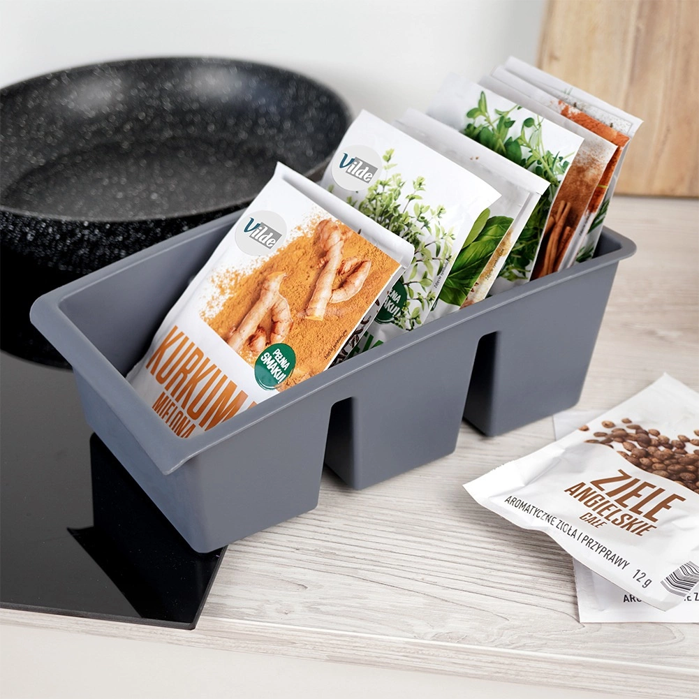 Pratique, cet organisateur de cuisine garde les sachets d’épices et d’herbes bien rangés et toujours à portée de main. Grâce à ses deux séparateurs internes, il est divisé en trois parties pour trier facilement les épices par type ou par usage. Le bord avant bas assure une bonne visibilité et une extraction rapide du bon sachet.