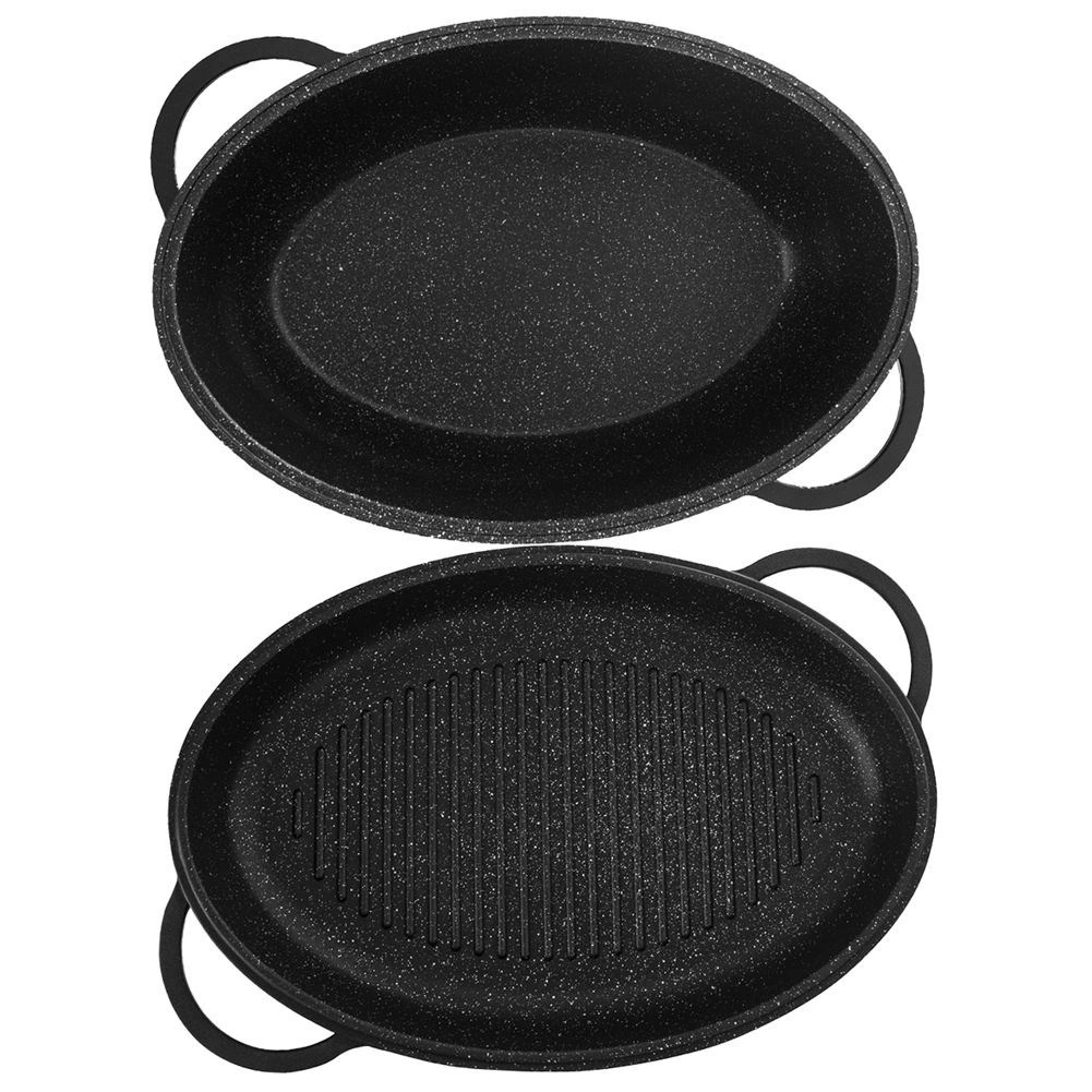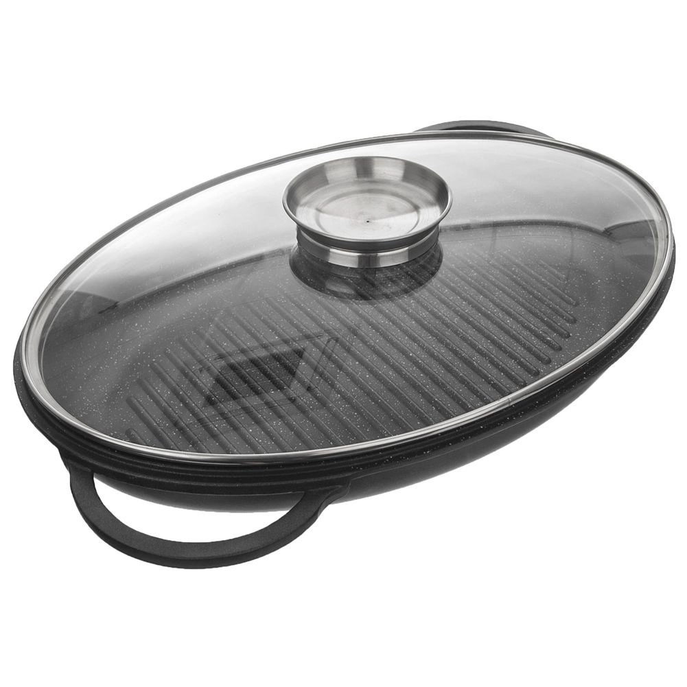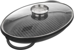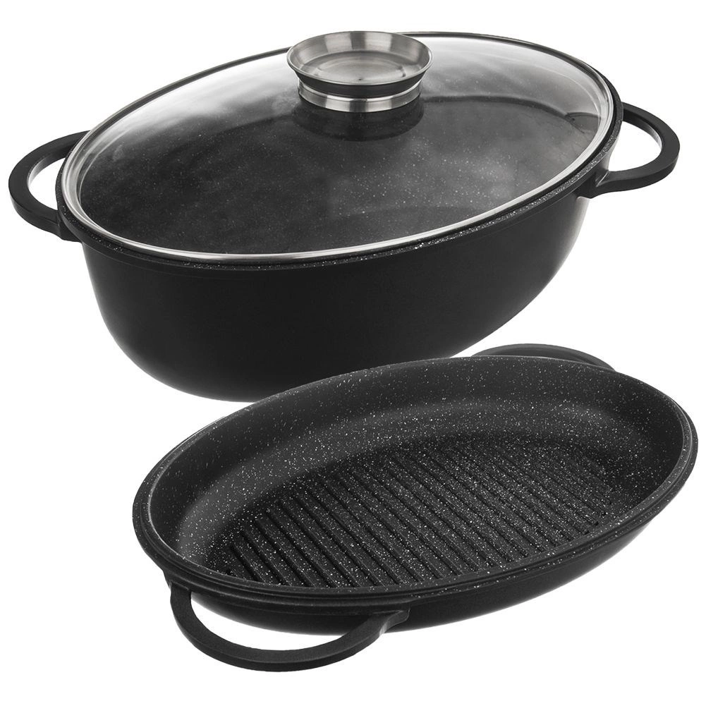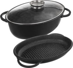 Ensemble ovale universel 3-en-1 pour rôtir, mijoter et griller. Aluminium moulé robuste avec double revêtement antiadhésif granit PFLUON GRANIT permettant de cuisiner avec un minimum de matière grasse. Couvercle en verre avec doseur de liquides pour arroser facilement sans soulever le couvercle. Compatible avec l’induction, le gaz, l’électricité, la vitrocéramique et le four. Nettoyage facile au lave-vaisselle.