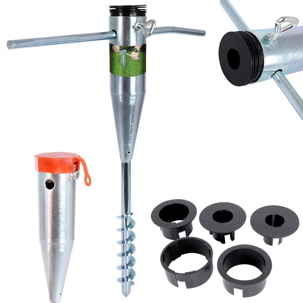 La pointe hélicoïdale intégrée et les poignées latérales permettent un vissage simple et rapide dans la terre, le sable ou la pelouse – il suffit de tourner et c’est fait.