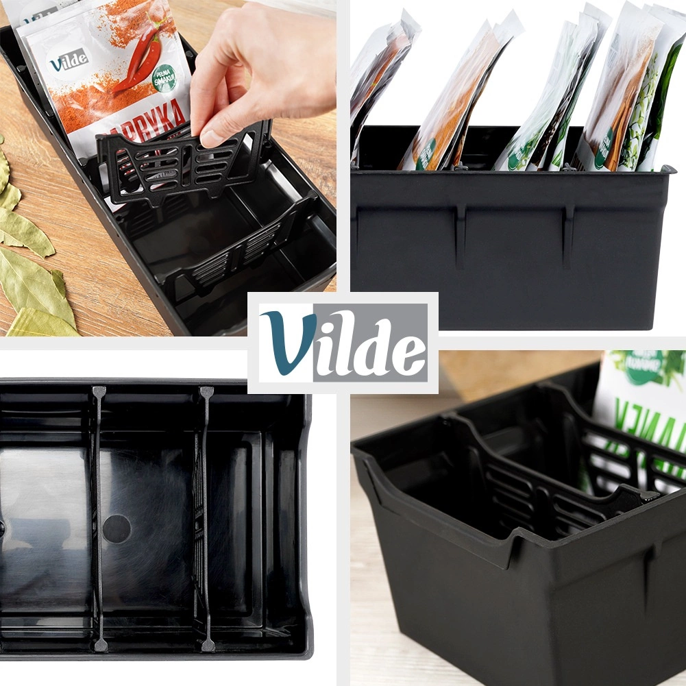Un organiseur d’épices de cuisine pratique de 30 × 13 × 8 cm qui aide à garder de l’ordre dans les tiroirs comme dans les placards. Grâce à ses 5 cloisons intérieures, vous séparez facilement les sachets par type. Fabriqué en plastique résistant et léger dans une élégante couleur noire, facile à entretenir et qui évite la dispersion des épices.