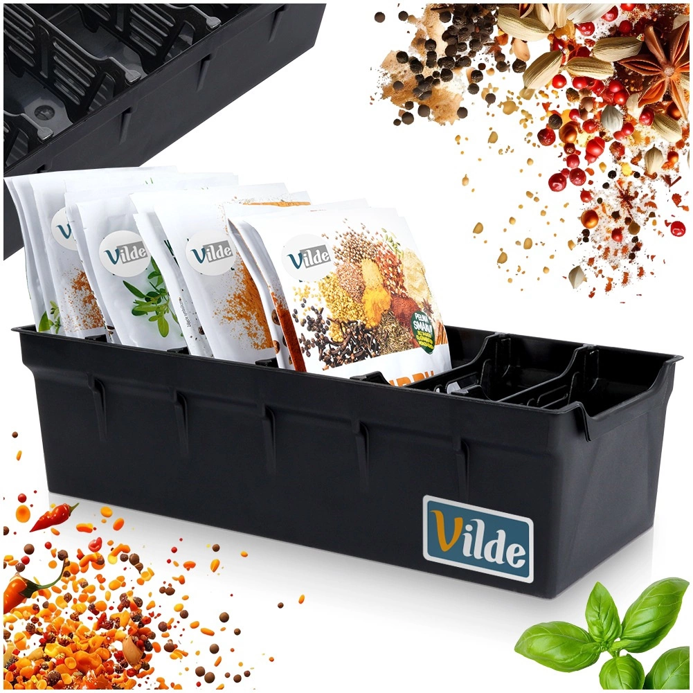 Grâce aux cinq séparateurs, vous triez rapidement vos épices par type ou usage – herbes, épices moulues, mélanges, ingrédients pour pâtisserie, etc. Idéal pour tiroirs et étagères, pour sachets ouverts comme fermés. La finition noire élégante s’intègre à toute cuisine et aide à maintenir ordre et clarté.