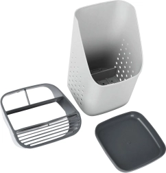 La base d’égouttage amovible collecte l’eau, évitant que les ustensiles trempent dans l’eau et gardant les surfaces alentour sèches. Les côtés perforés favorisent la circulation de l’air pour un séchage rapide. Sa conception légère, solide et facile à laver convient aussi bien comme égouttoir après lavage que comme support permanent sur le plan de travail.