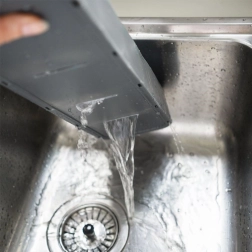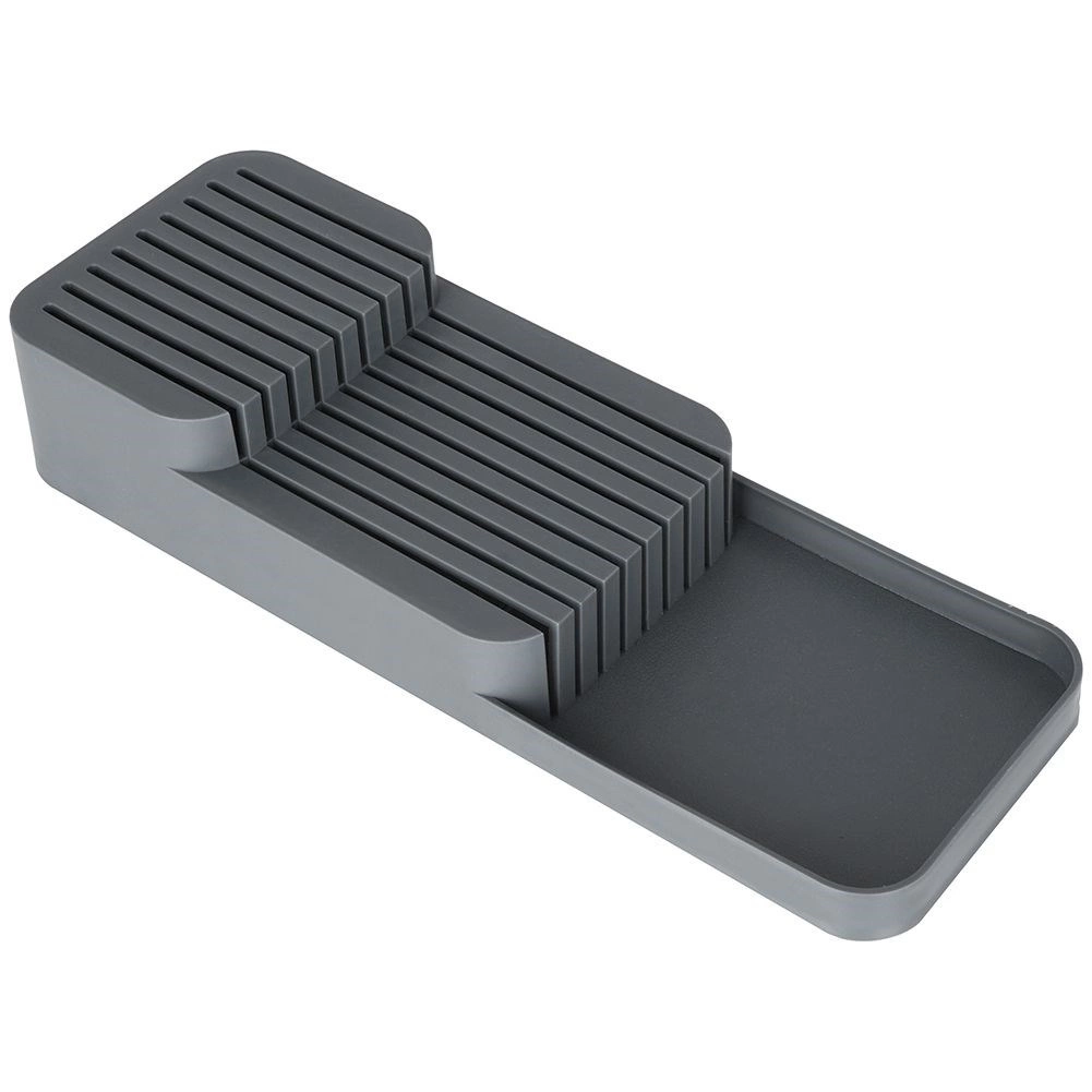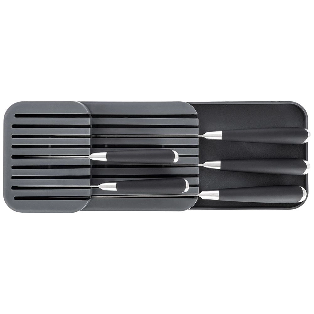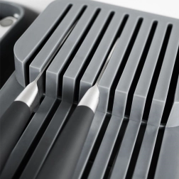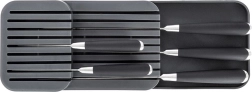 Sa forme élancée et sa stabilité antidérapante permettent une utilisation dans un tiroir ou comme range-couteaux sur le plan de travail.