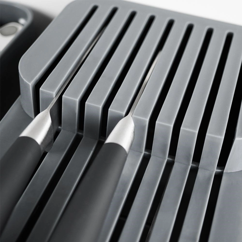 L’organisateur peut accueillir jusqu’à 18 couteaux de différentes longueurs – des petits couteaux aux couteaux de chef plus longs. Chaque couteau dispose de sa propre glissière, qui protège les lames de l’émoussement et assure un retrait en toute sécurité. Le matériau est facile à entretenir : il suffit d’essuyer ou de rincer.