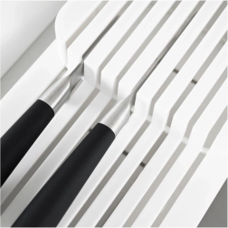 Pratique et peu encombrant, cet organiseur pour couteaux aide à garder vos lames rangées de façon claire et sûre. La construction à deux niveaux économise de la place dans le tiroir, tandis que les rainures profilées maintiennent chaque couteau en position. Son design minimaliste blanc s’intègre à toute cuisine moderne.