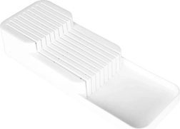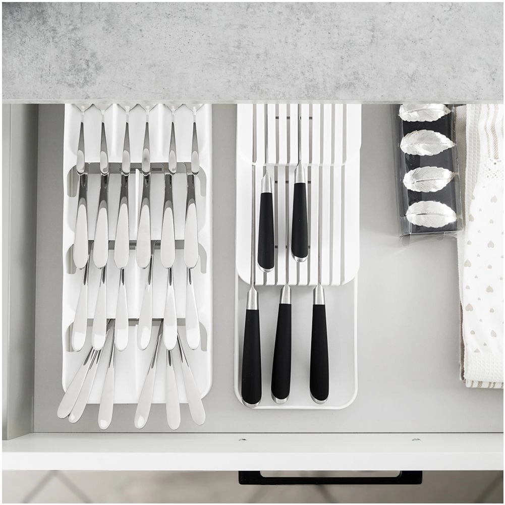 Gardez votre cuisine parfaitement organisée avec cet organiseur de tiroir pour couteaux blanc de 39 × 14,5 × 7,5 cm. Il offre jusqu’à 18 emplacements pour couteaux courts et longs, un rangement à deux niveaux pour gagner de la place, et une conception résistante en plastique de qualité. Il est compact, sécurisé et grâce à ses dimensions universelles, il s’adapte à la plupart des tiroirs de cuisine.