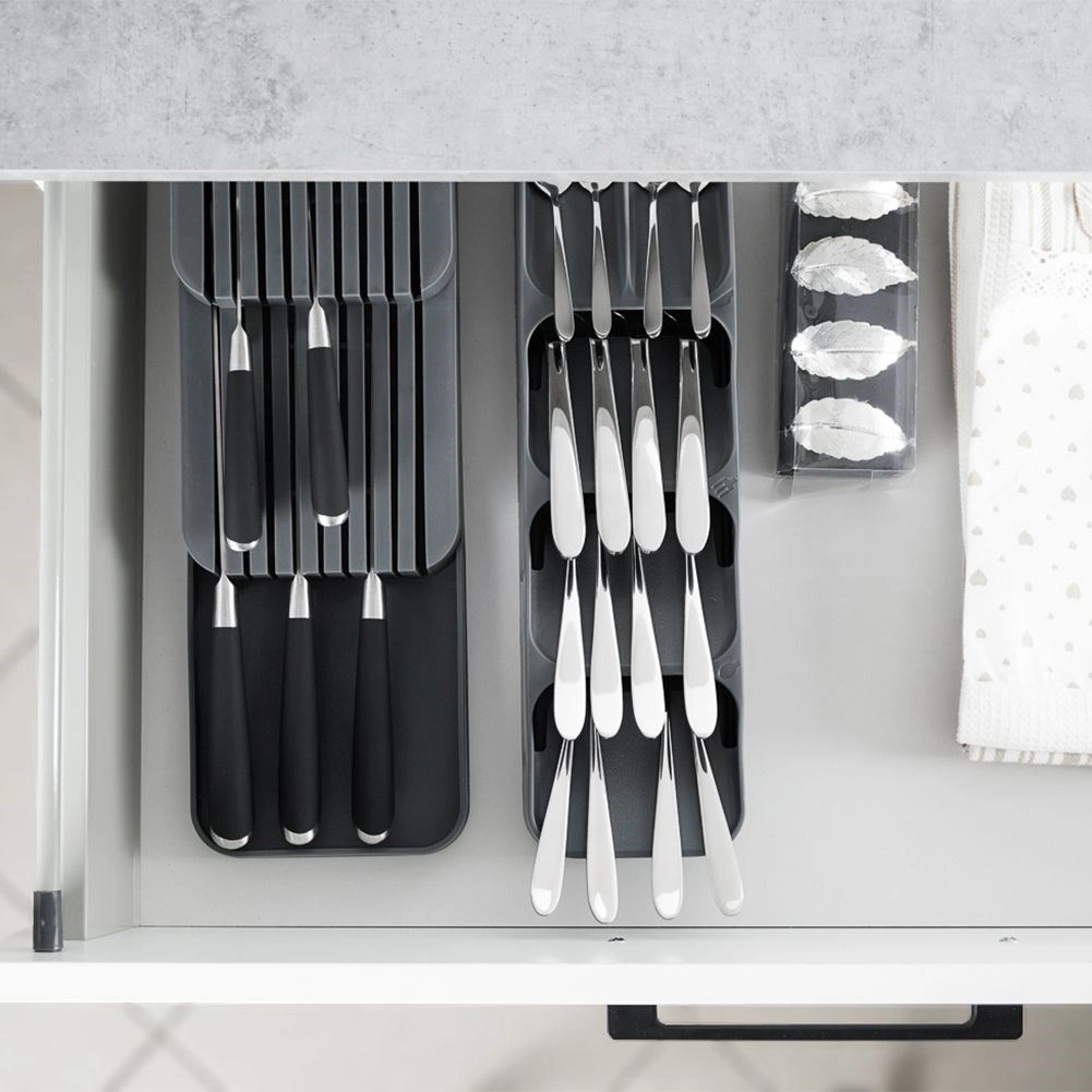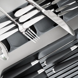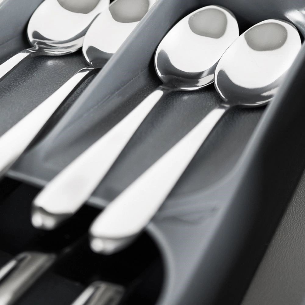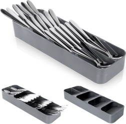 Sa conception durable en plastique de qualité, d’un élégant gris, garantit un nettoyage aisé et une longue durée de vie. Idéal pour ranger cuillères, fourchettes, couteaux ainsi que petites cuillères et petites fourchettes, chaque pièce ayant sa place dédiée.