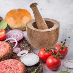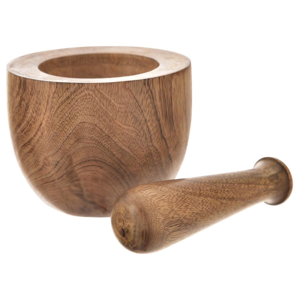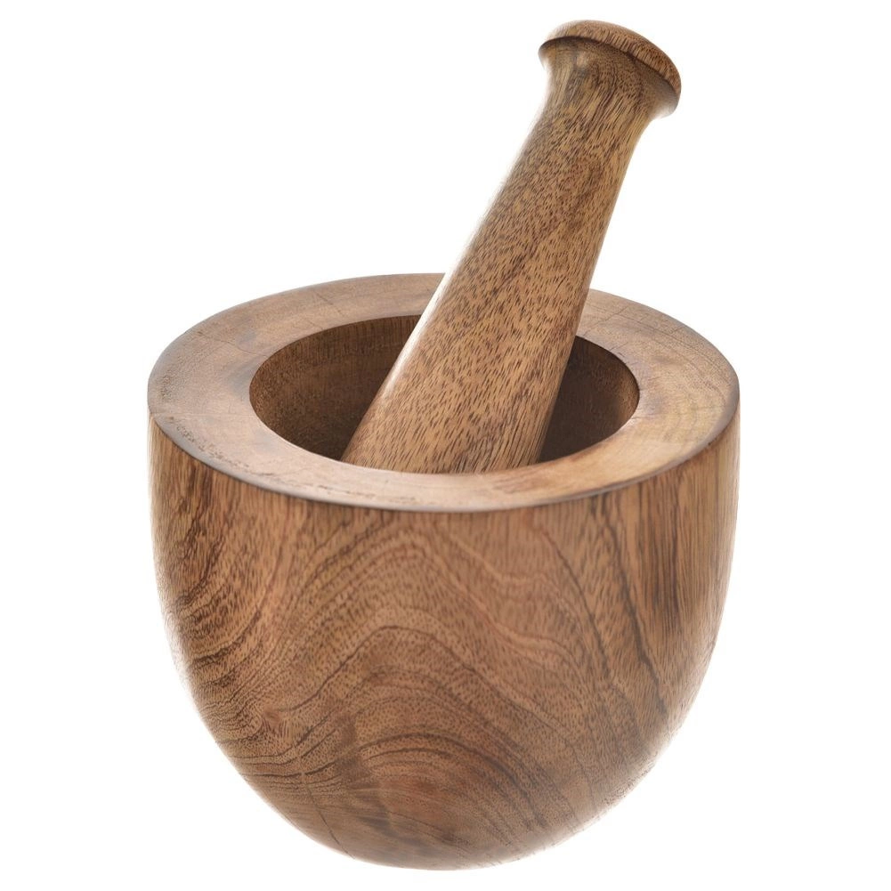 Mortier robuste en bois de manguier avec pilon ergonomique pour écraser et moudre facilement herbes, épices, noix et graines. Le matériau naturel est résistant, hygiénique et écologique. L’intérieur non poli du bol garantit une meilleure efficacité de broyage et une libération d’arômes plus riche pour des mélanges parfumés et un pesto maison parfait.