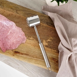 L’acier inoxydable hautement résistant garantit une longue durée de vie, une hygiène optimale et un nettoyage facile au lave-vaisselle. L’attendrisseur convient pour le bœuf, le porc, la volaille et le poisson, et peut aussi servir à concasser des noix ou de la glace. L’anneau en bout de poignée offre un accrochage et un rangement pratiques.