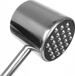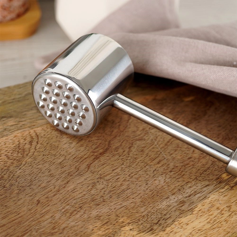 Massette de cuisine robuste en acier inoxydable, idéale pour préparer steaks, côtelettes et escalopes. La face lisse aplatit efficacement les tranches, tandis que la face à reliefs attendrit la viande et rompt les fibres pour un résultat plus juteux. Grâce à son poids équilibré et à sa poignée confortable, la prise en main est excellente et le travail rapide et précis.