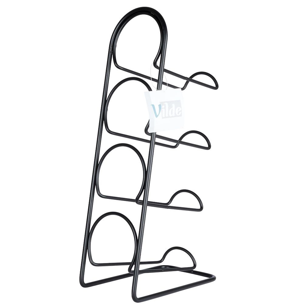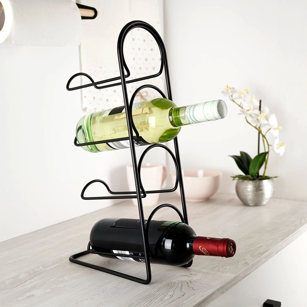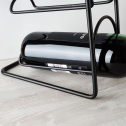 Porte-bouteilles pratique et élégant au design filaire minimaliste, pouvant accueillir jusqu’à quatre bouteilles de vin ou d’autres boissons. La structure métallique solide en noir mat est durable, stable et facile à entretenir. Grâce au rangement horizontal, le vin reste couché correctement et le bouchon demeure humide.
