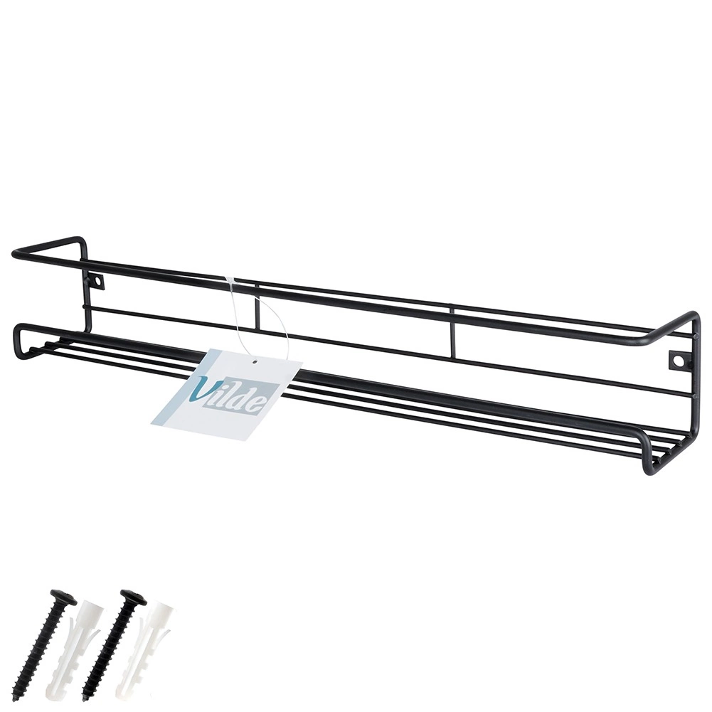 Pratique étagère à épices murale en métal au coloris noir élégant, elle économise de l’espace sur le plan de travail et garde vos épices et petits objets bien organisés au même endroit. Grâce à ses dimensions compactes 40 × 6,5 × 6,5 cm, elle convient à toute cuisine, salle de bain ou entrée. Construction métallique robuste, montage simple et usage polyvalent dans un style loft moderne.